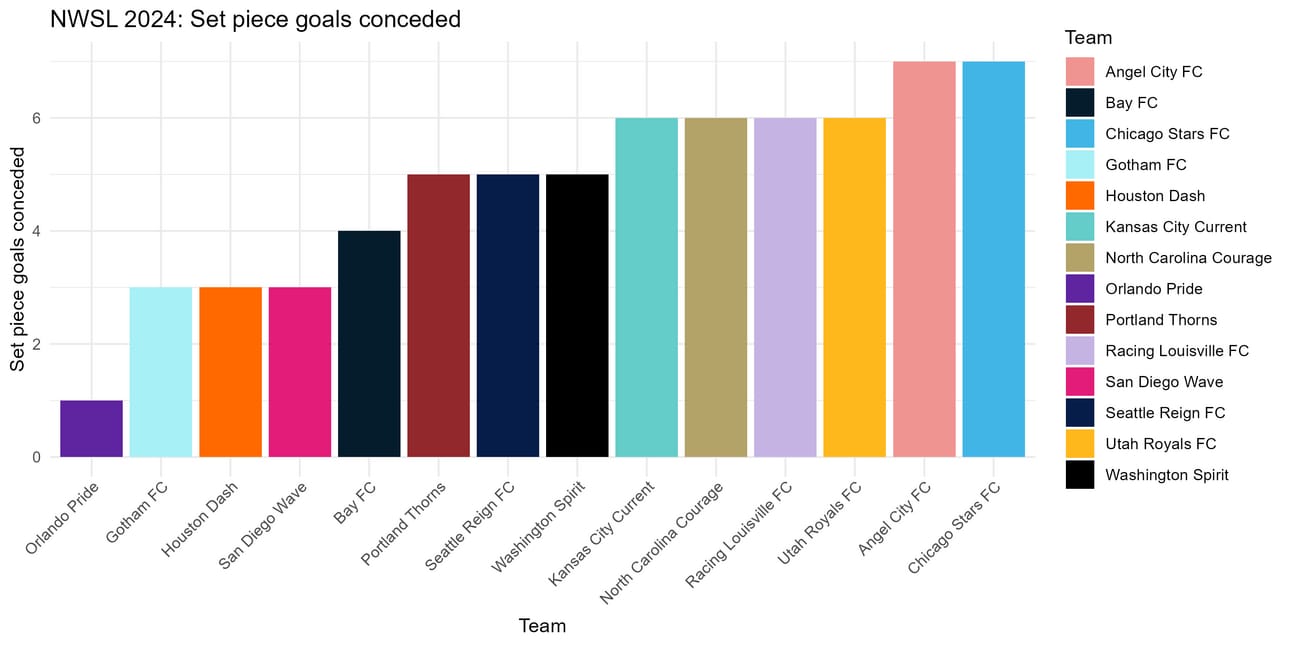 Angel City allowed the second-fewest set piece shots in the league, with 42. That means that 1 of every 6 set piece shots turned into a goal–that is abysmal. Let’s take a closer look at that specific statistic.