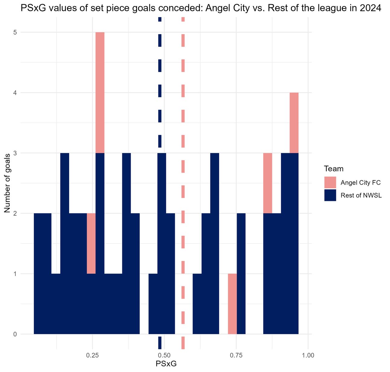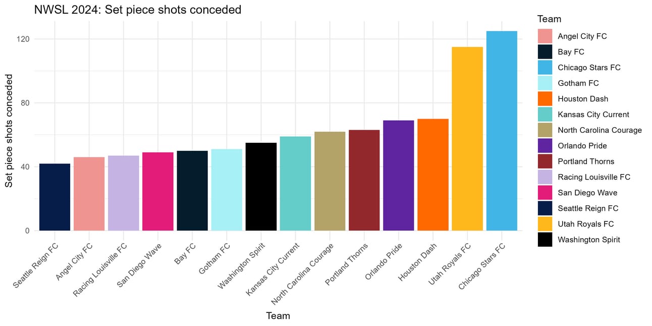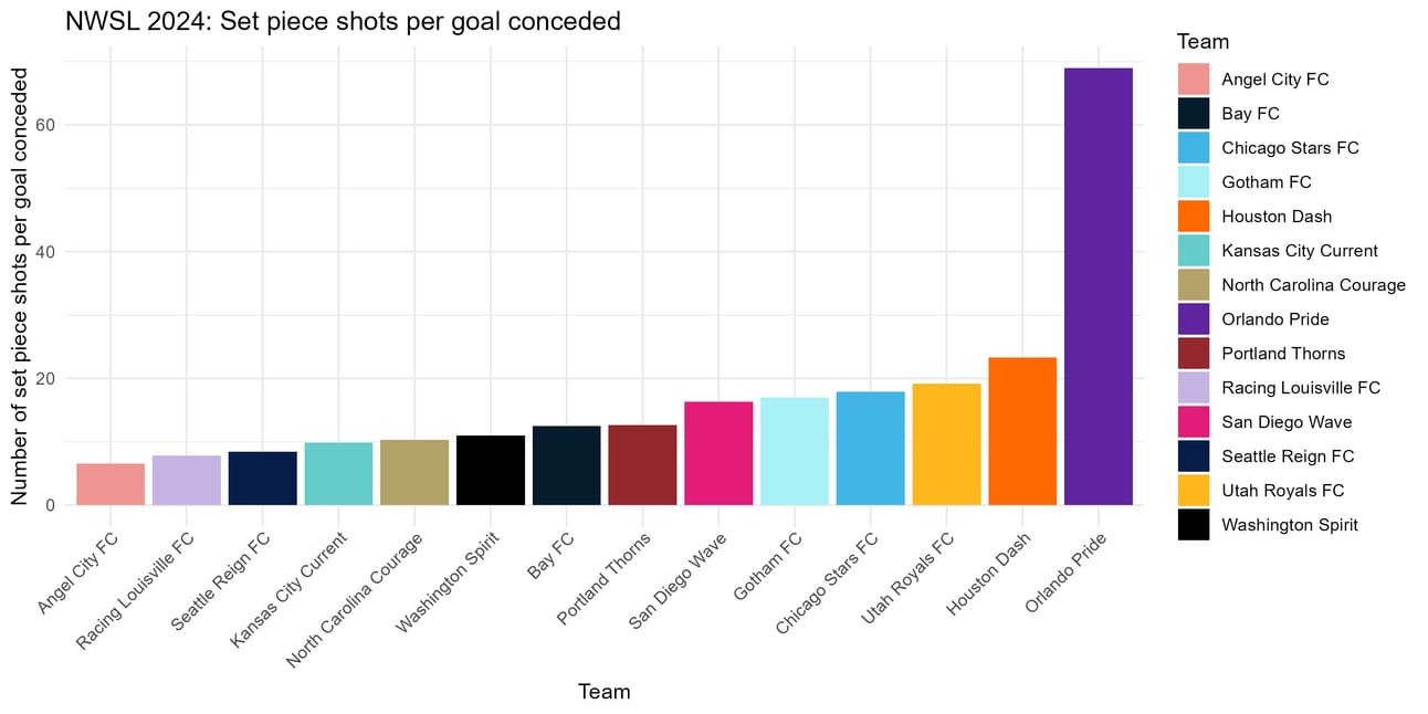 We can see the result of everything we discussed above in this final graph–Angel City has a PSxG per set piece goal that is 0.08 higher than the rest of the league’s average. To put that into perspective, the mean xG per shot for all set piece shots against all other teams in 2024 was 0.09, so 0.08 is no small number when it comes to xG and PSxG.