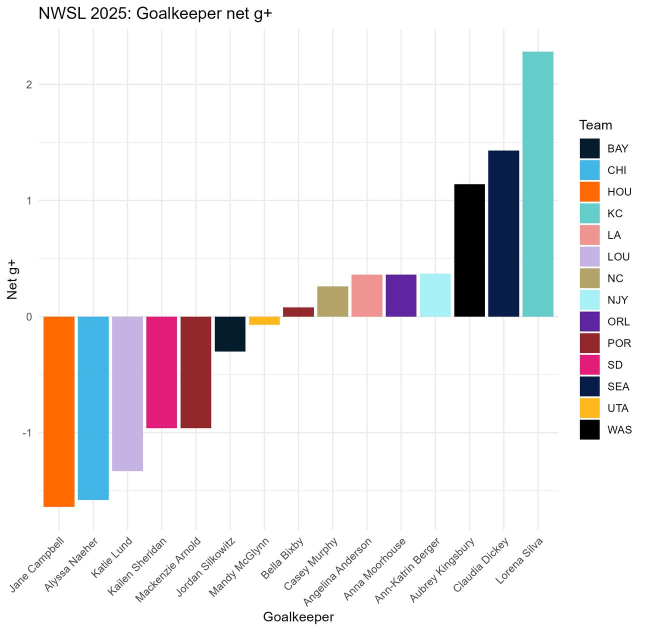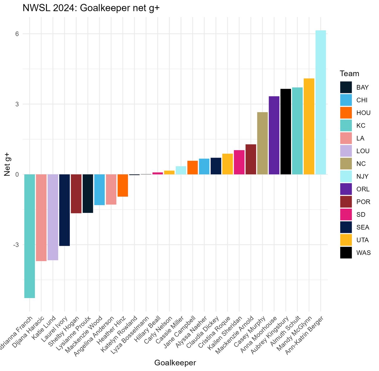 Comparatively, Angelina Anderson is fifth this season so far on both net g+ and shotstopping g+. So while she isn’t going to be a holy grail, her positive g+ values (i.e. her actions decrease the team’s chances of conceding more than they increase them) make her a much better option at keeper than Didi Haracic was last season.
