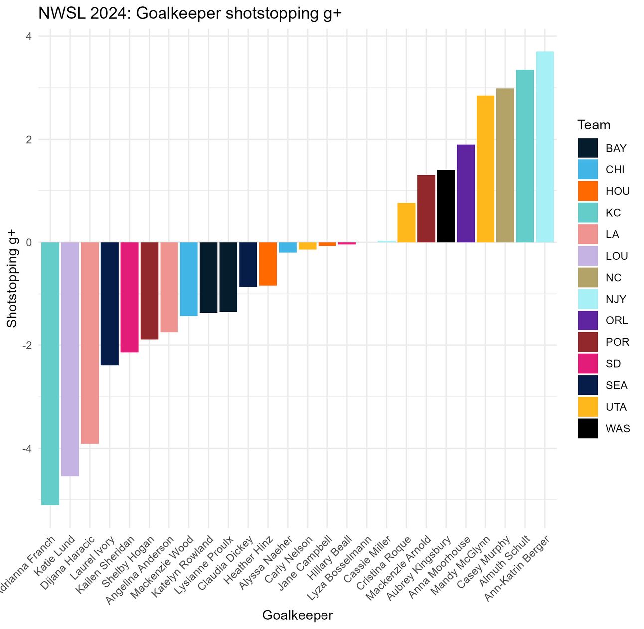 However, Angel City has a noticeably higher PSxG per shot while facing the same opponents as the rest of the league–this could be a result of poor defending or bad luck but either way, the same players are able to create more value on their shots alone against Angel City.