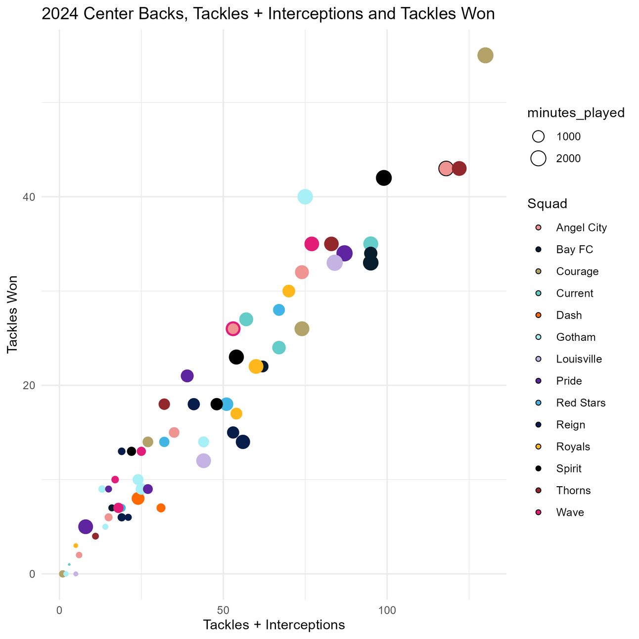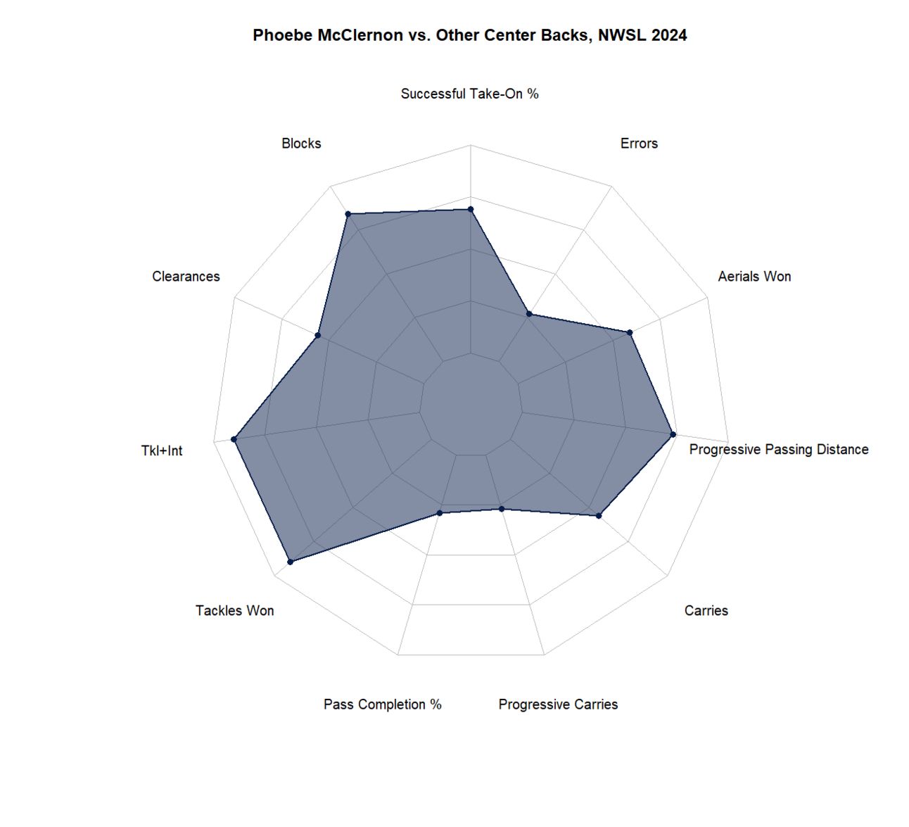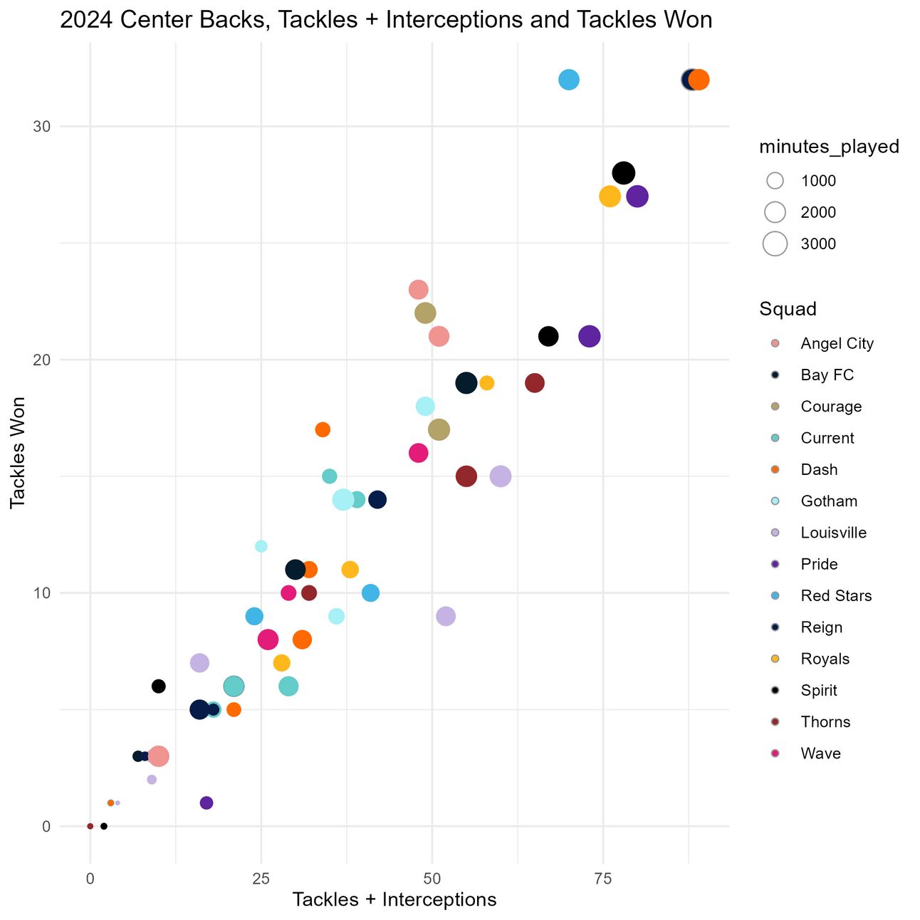 McClernon (outlined in gray above) tied for the most tackles won among center backs in the 2024 season, and was second to only Paige Nielsen in tackles and interceptions (88 vs. 89). It is important to recognize here that players like her and Nielsen got more tackles largely because they had more to defend than a high-pressing team like Gotham or a possession-oriented team like the Courage, but they still got (and won) more tackles than the other center backs who were on teams with similar defensive predicaments.