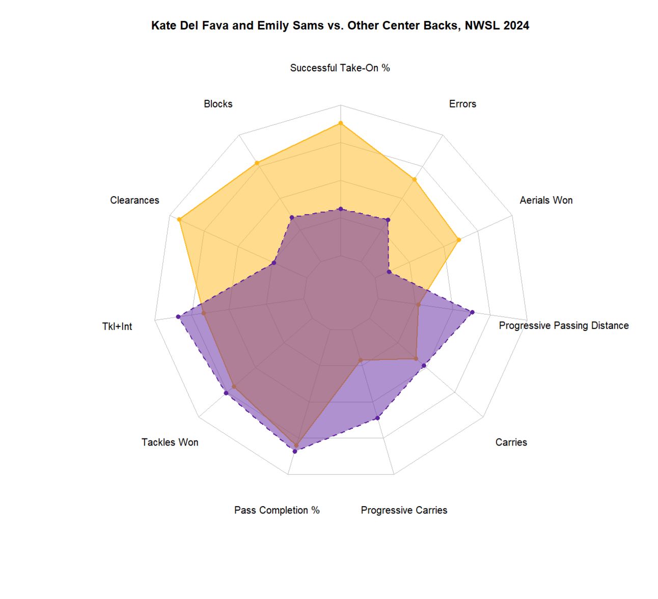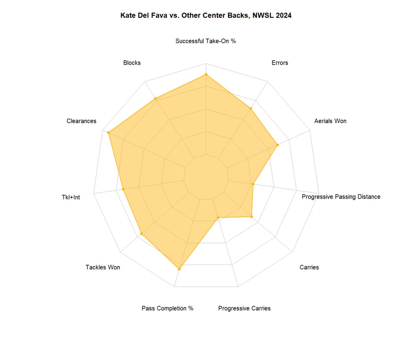 Kate Del Fava is a defensively strong center back who is good at keeping the ball out of the net and winning the ball in dangerous situations. Although she has a generally high pass completion percentage, her progressive play leaves a little to be desired, but that can be accounted for with a more progressive passing-minded center back partner and more attacking-minded fullbacks–Kate Del Fava is good at the important stuff for a center back, which is defending. For context, this is her in those same metrics compared to 2024 defender of the year, Emily Sams.