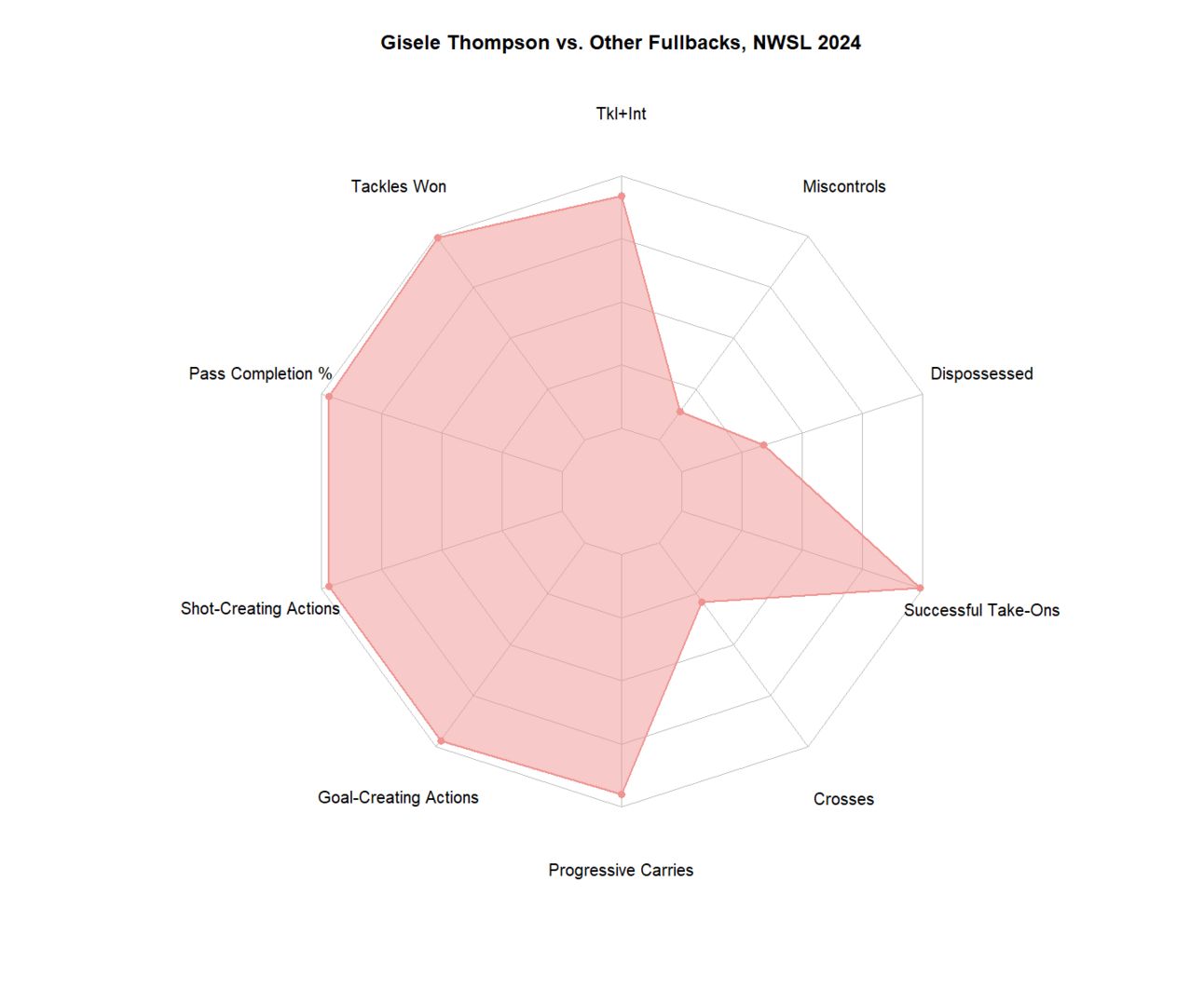 Among all defenders in the 2024 NWSL season, Gisele Thompson had the second-highest net goals added (g+) per 90, from a combination of offensive and defensive actions.