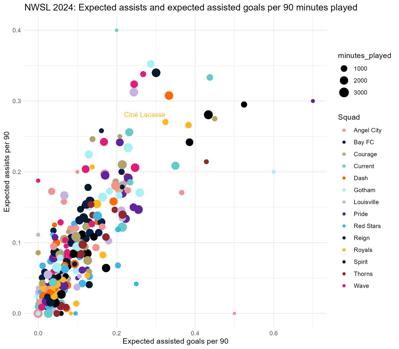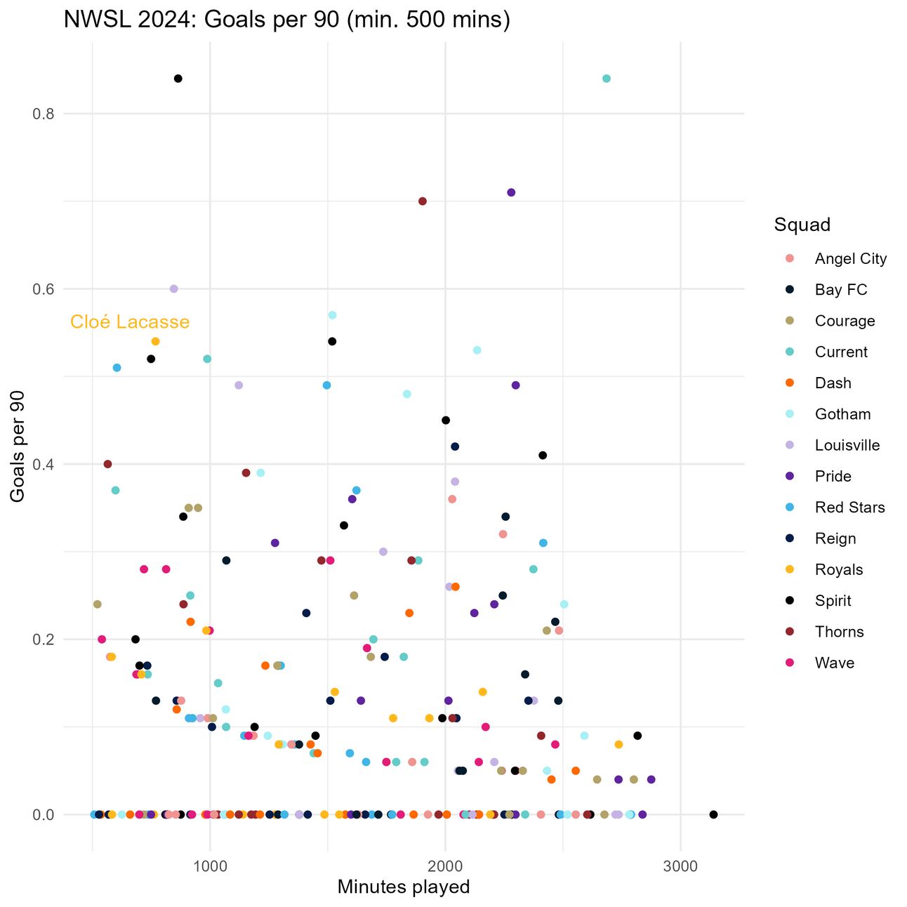 There is only one player in the league (Uchenna Kanu) whose team didn’t finish in the top 4 last year who scored more goals per 90 than Cloé Lacasse last season, if we are only looking at players who played 500 or more minutes last year. Cloé Lacasse came into the squad and did exactly what they needed her to do: score goals.