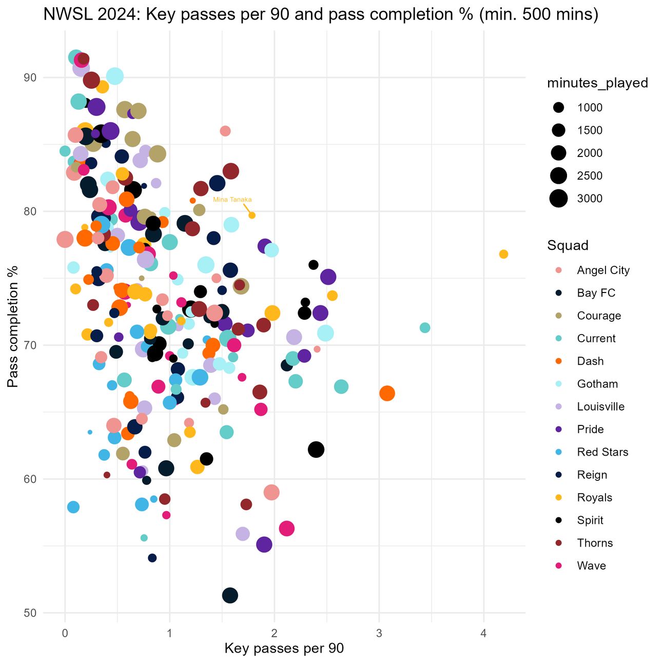 Mina Tanaka understands the importance of just shooting, attempting the ninth most shots per 90 among players with at least 500 minutes in 2024. She also ranks third among players who are not from top-4 teaams, and first among players whose teams did not make the playoffs. A team can’t score goals without players who are willing to shoot, and Mina Tanaka has been doing exactly that for the Utah Royals.
