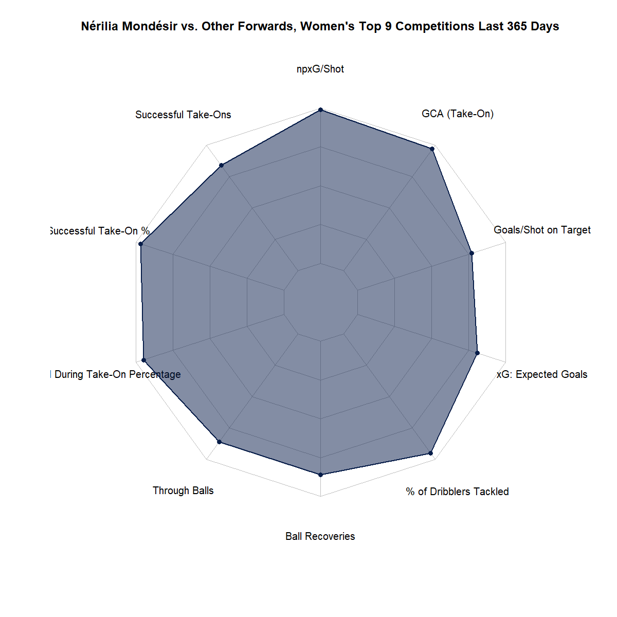 There’s admittedly little NWSL data out there on Nérilia Mondésir, but her statistics in the past year compared to the top 9 women’s leagues in the world tell a story that is very impressive for a player on a mid-table team in the Division 1 Féminine, a league known for its disparity. Here’s what’s noteworthy about her: