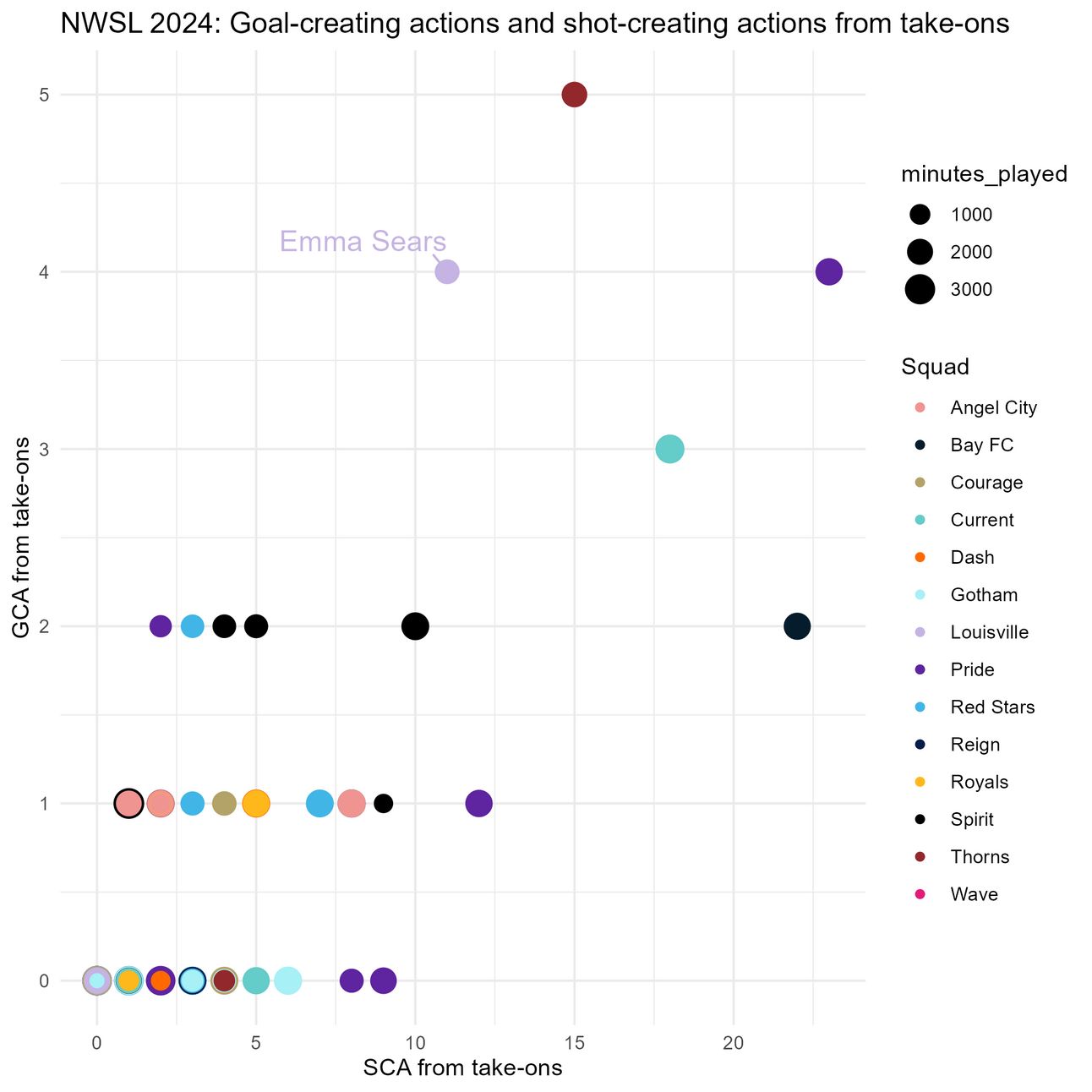 We already saw this in the GIF of her goal against Kansas City, but Emma Sears is in the same league as Barbra Banda, Temwa Chawinga, and Sophia Wilson when it comes to shot-creating actions and goal-creating actions that come as a result of her taking defenders on.