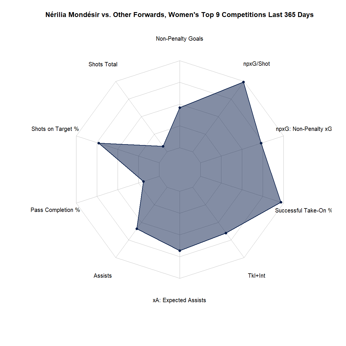 The graph above shows Mondésir’s top strengths when compared to other attackers in the top 9 women’s leagues in the world. She makes quality shots, ranking in the 99th percentile for non-penalty xG per shot taken. She also ranks high (97th percentile) for both successful take-ons and goal creating actions that come as a result of take-ons.