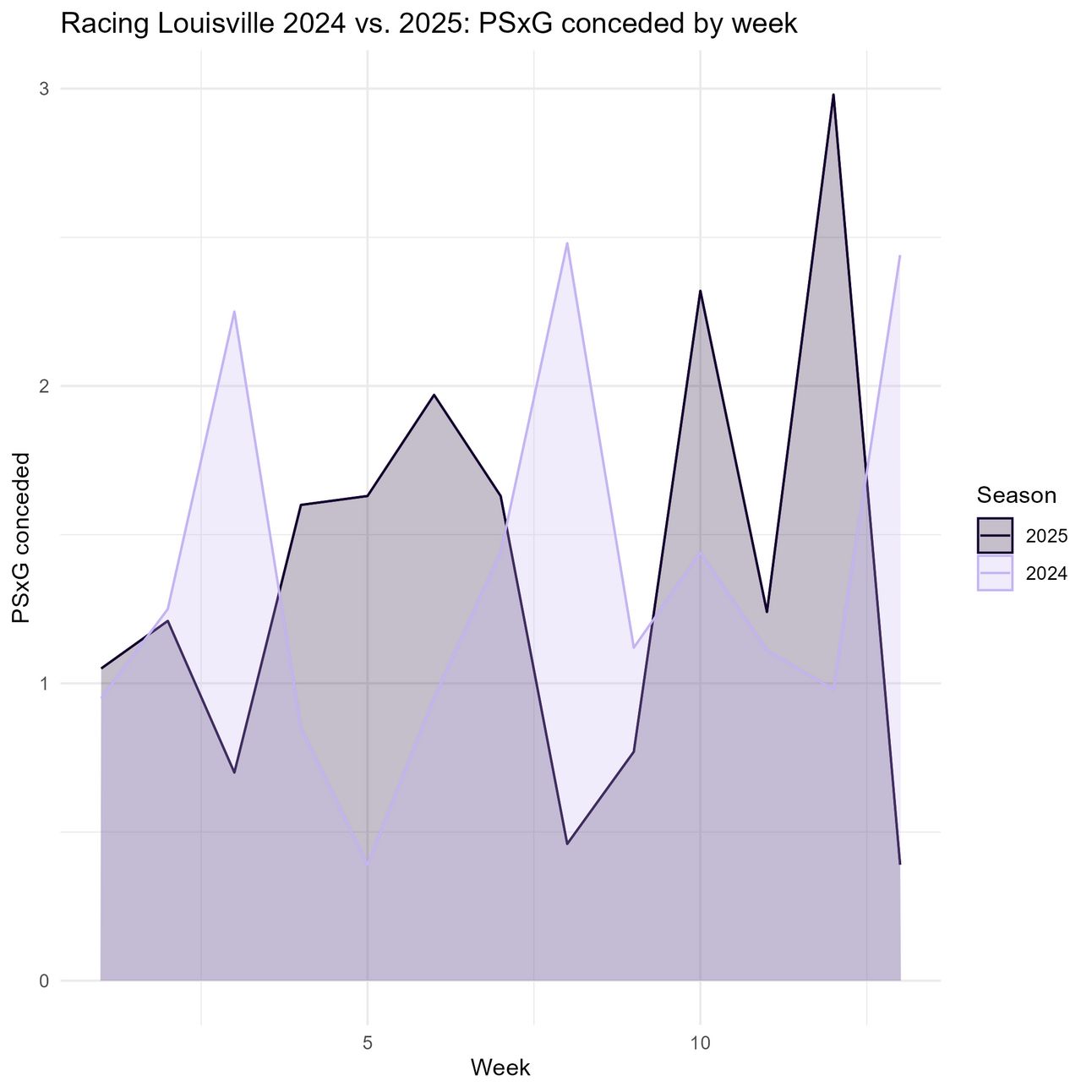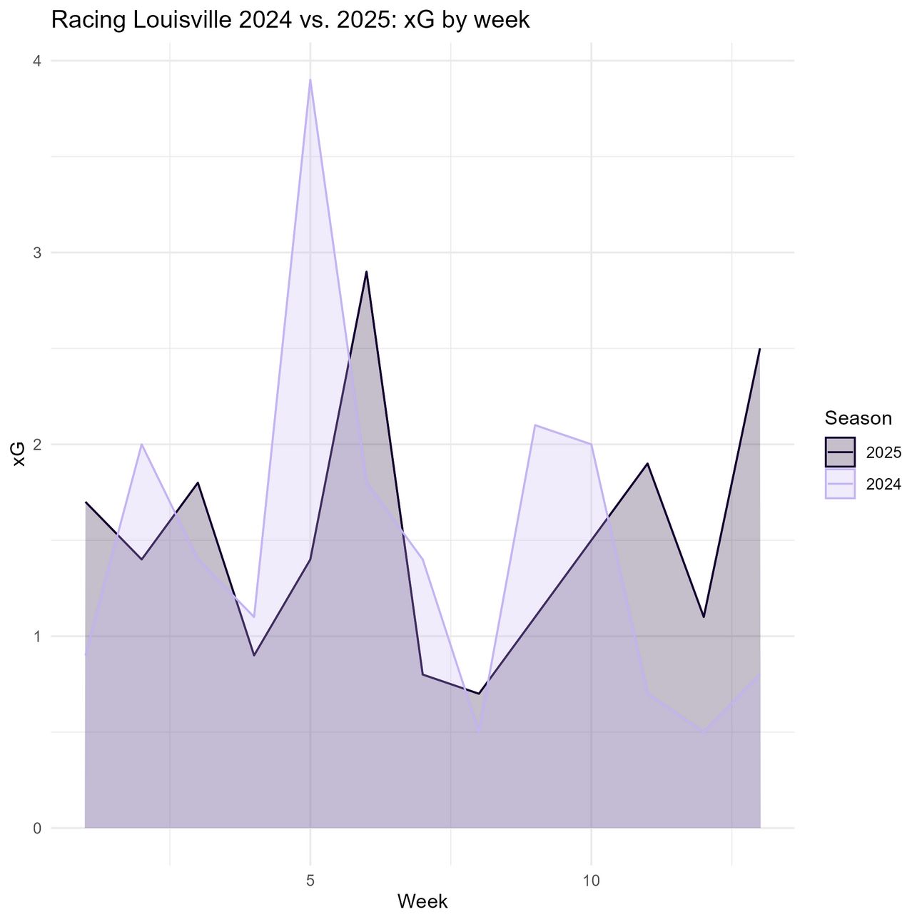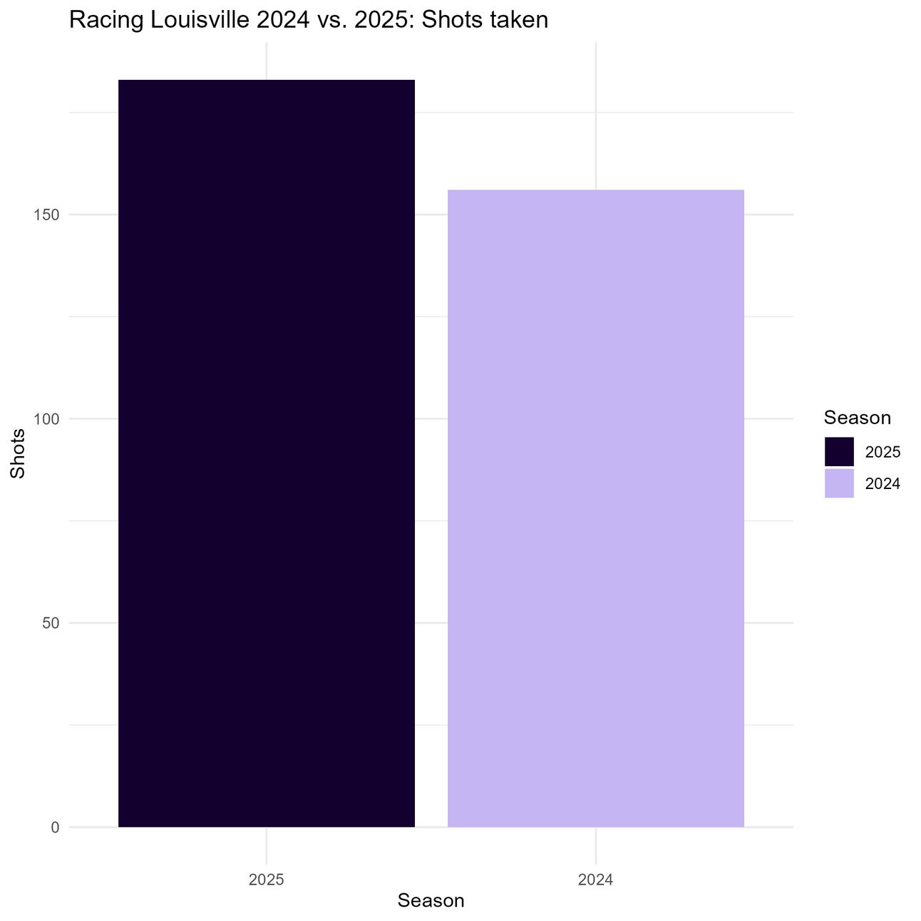 This season, Louisville has played each opponent once so far. In order to keep things fair, I will be comparing this season against the 13 matches from 2024 where Racing Louisville played each opponent for the first time, so that strength of schedule is not a factor–this is what I mean when I refer to “this point last season.” I chose not to do paired tests (in this case, this would mean comparing Louisville’s performance against the Wave this season vs. their first performance against the Wave last season, for example) because teams change a lot season over season and so this didn’t feel like a particularly useful data point.