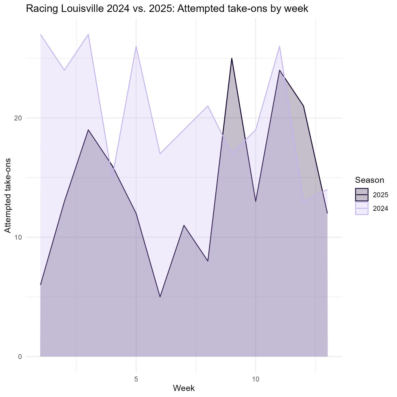 Null hypothesis: Louisville is not attempting more take-ons than they were at this point last season.