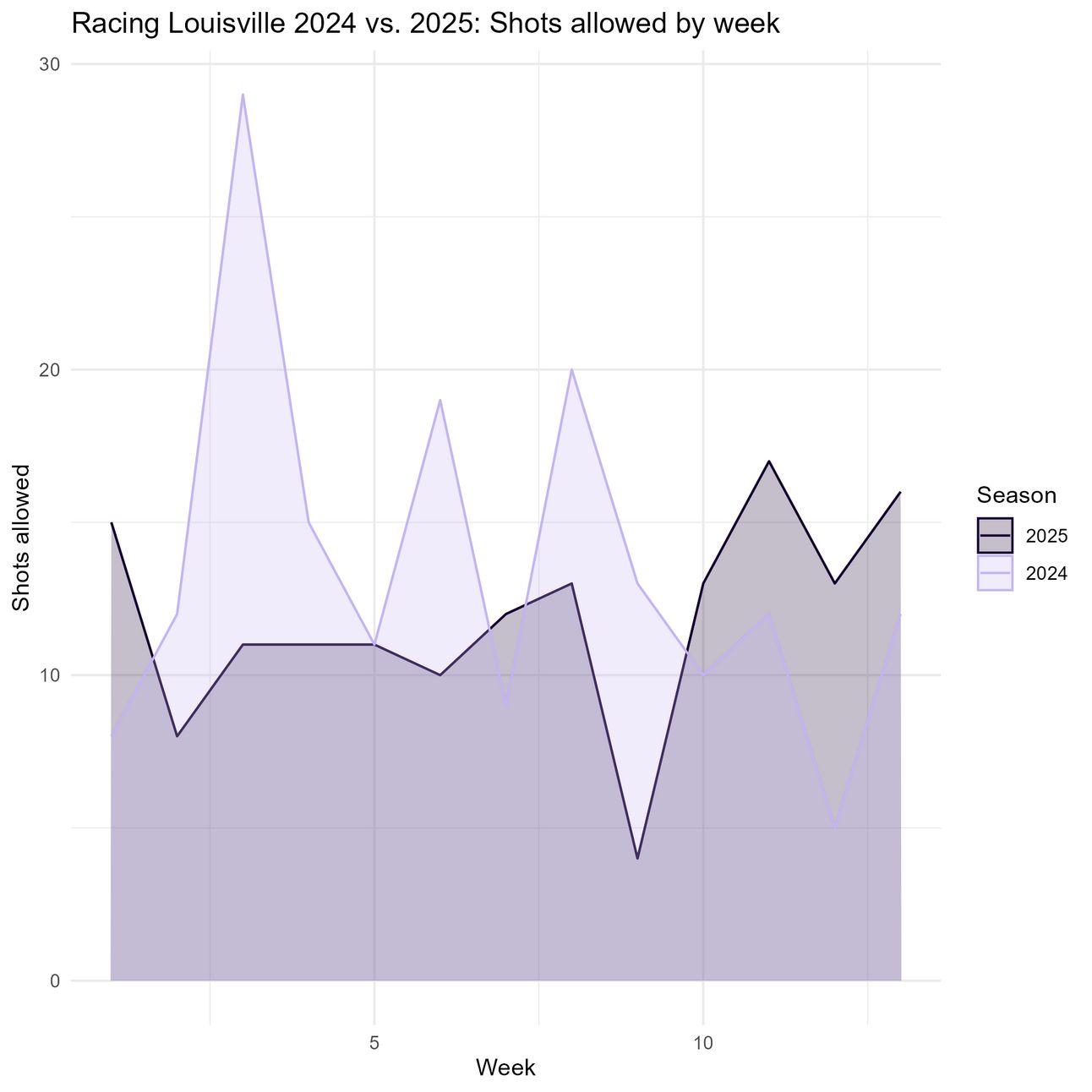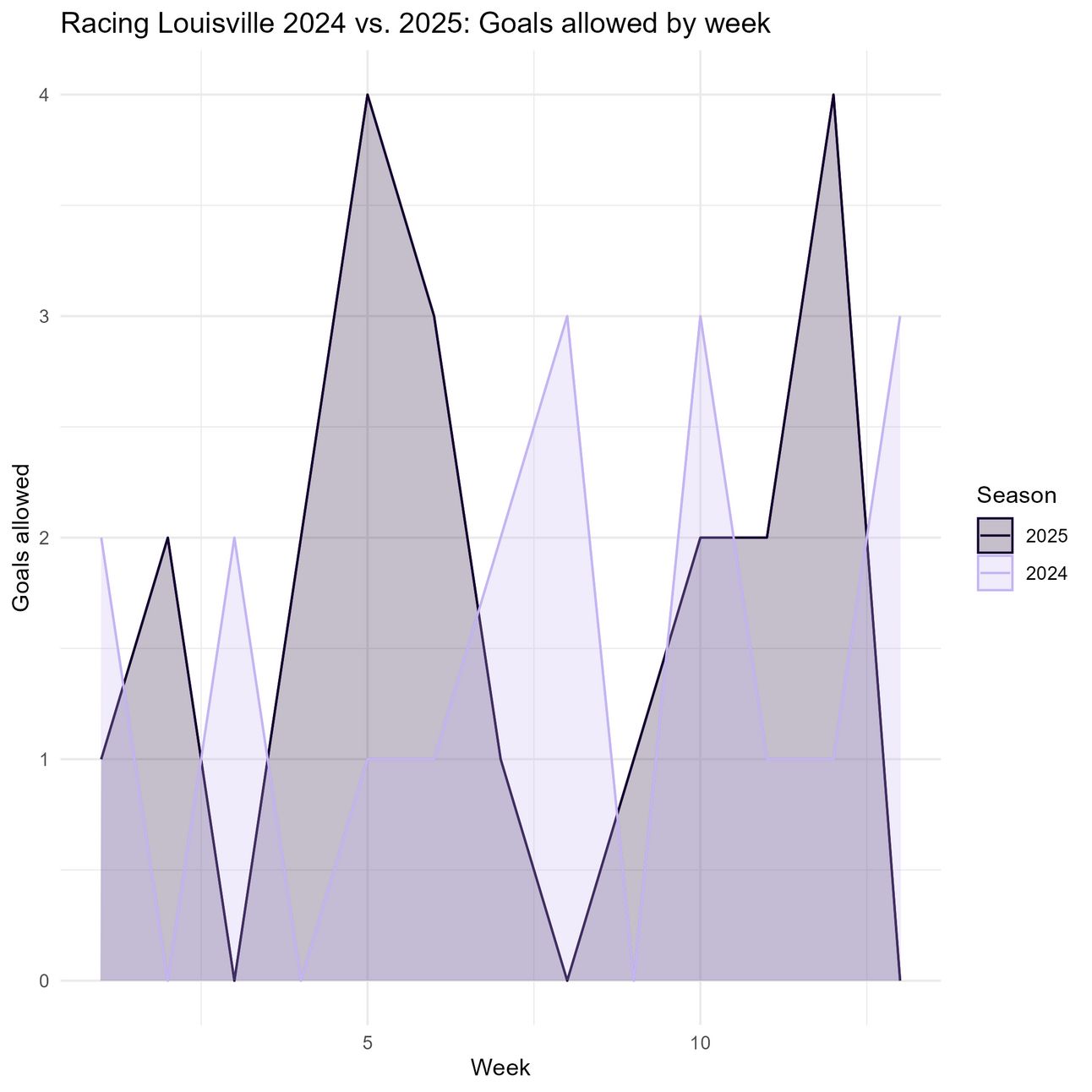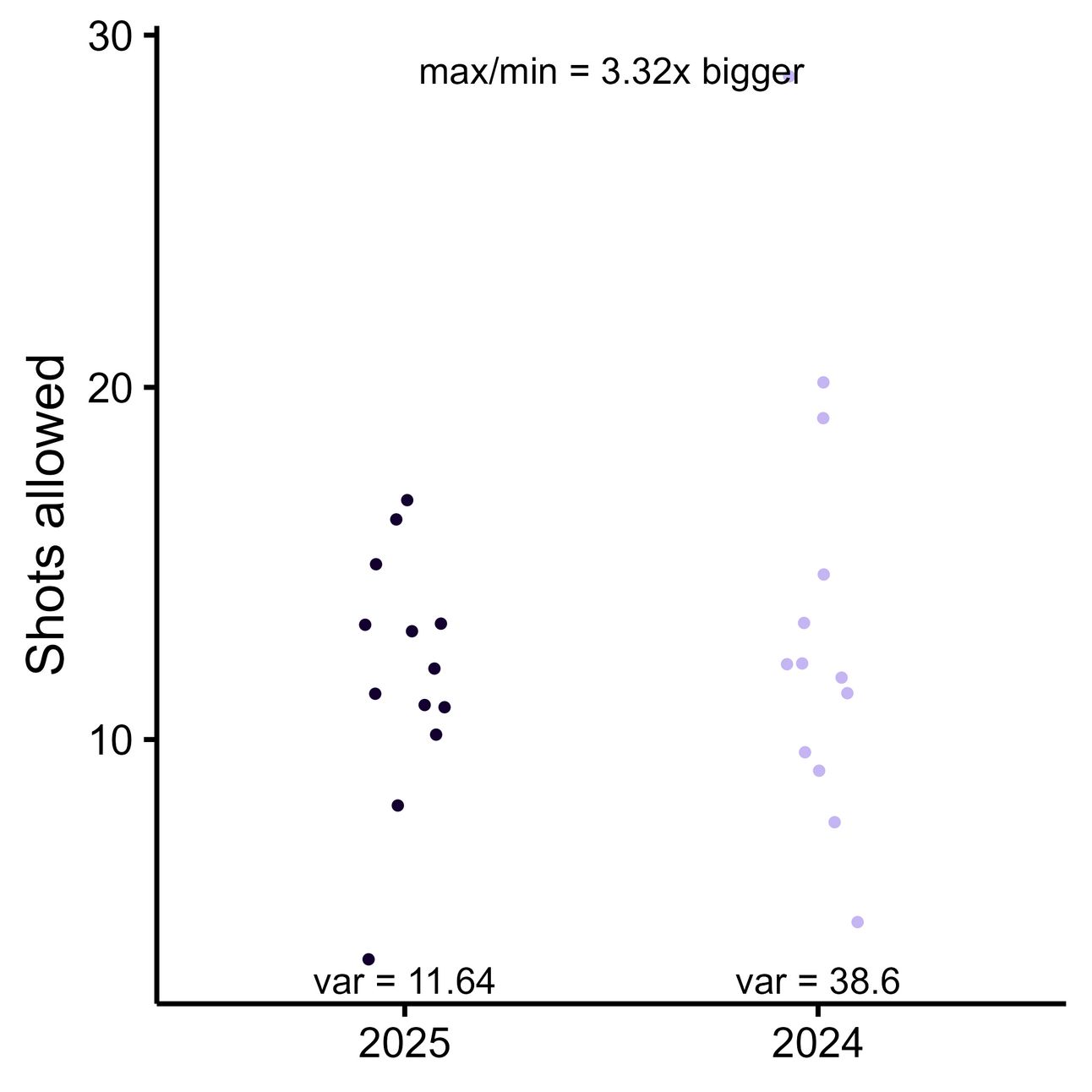 If we plot the variance of these two seasons’ goals allowed per game, 2025 appears to have more variance, which isn’t a great sign.