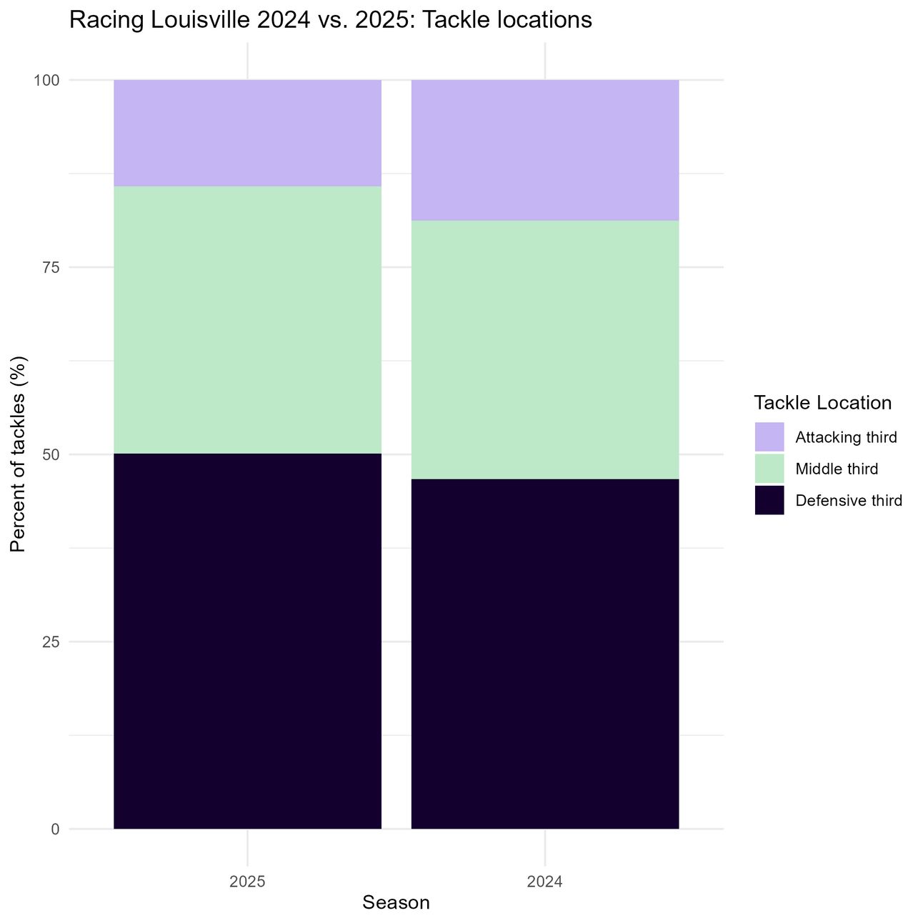 First, it looks like Louisville is winning a smaller share of its tackles in the attacking third this season, almost enough to be statistically significant.