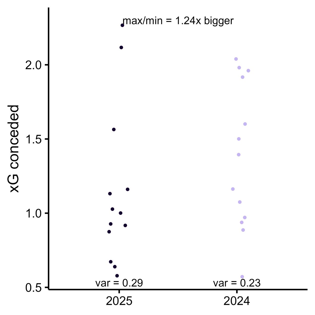 If we plot the variance of these two seasons’ xG conceded per game, both seasons have pretty low variance, but 2024 takes the cake.
