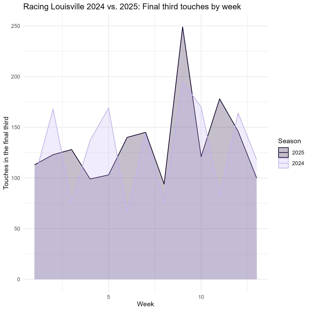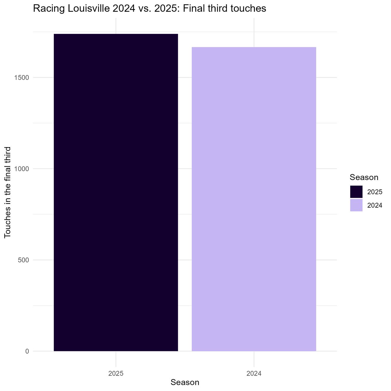 Null hypothesis: Louisville has not had more touches in the final third than they did at this point last season.