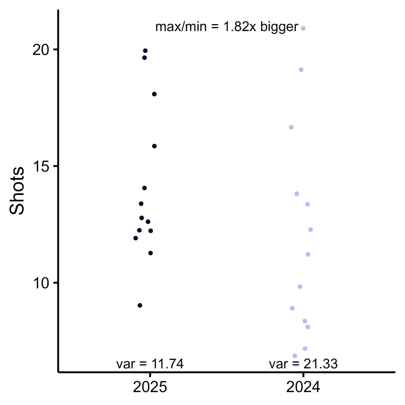 If we plot the variance of these two seasons’ xG generated per game, 2025 appears to have significantly less variance.