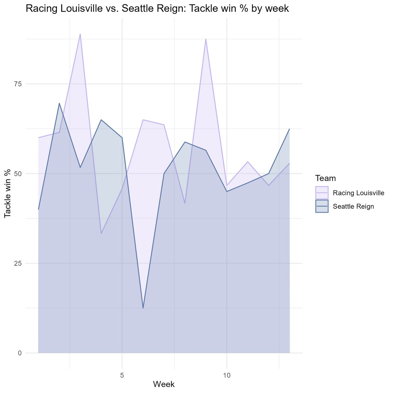 Null hypothesis: Louisville is not winning a higher percentage of their tackles than Seattle this season.