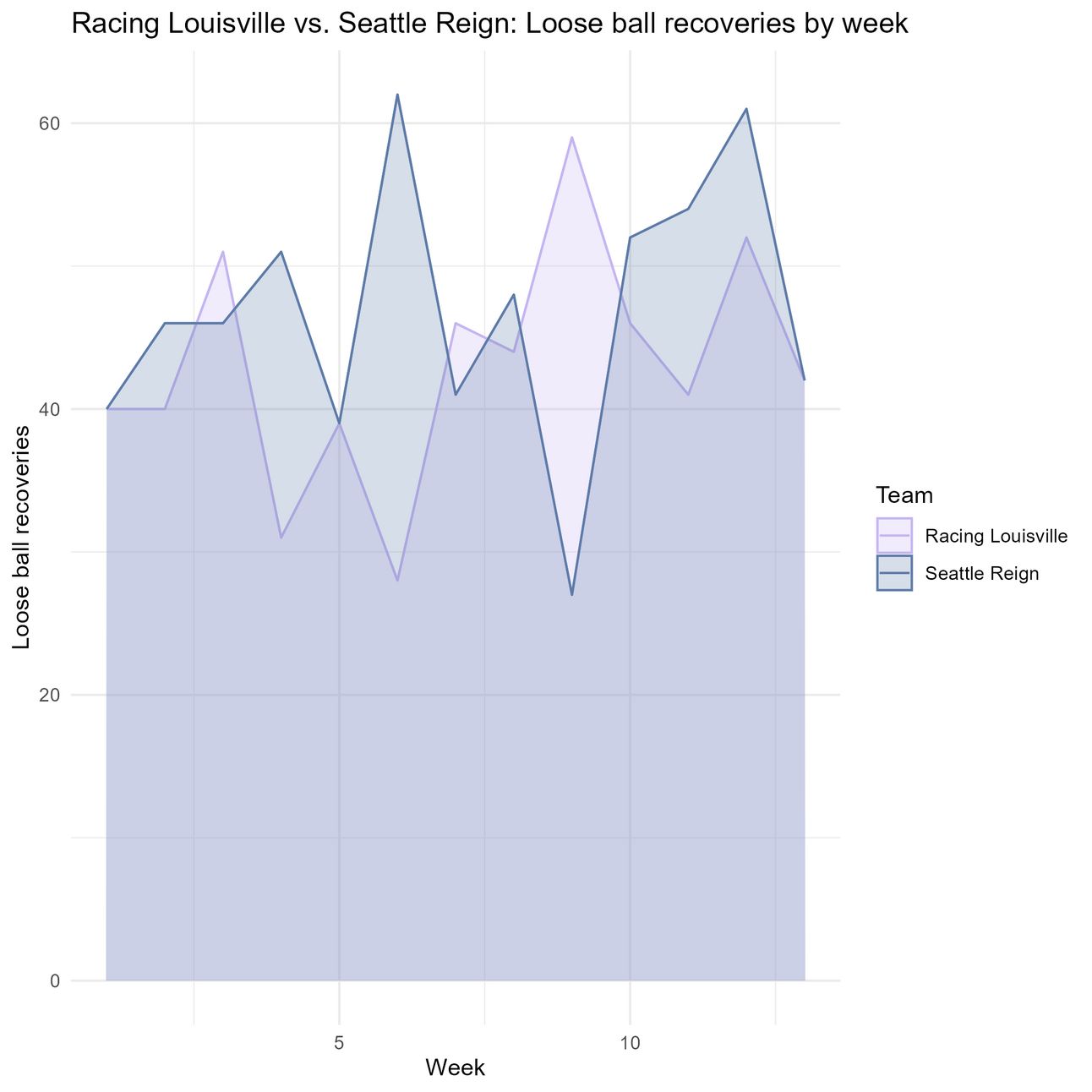 Null hypothesis: Louisville is not recovering more loose balls than Seattle this season.