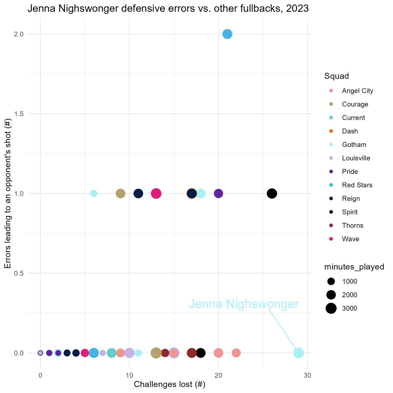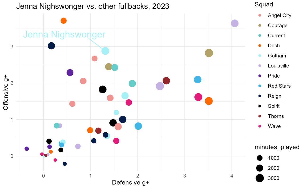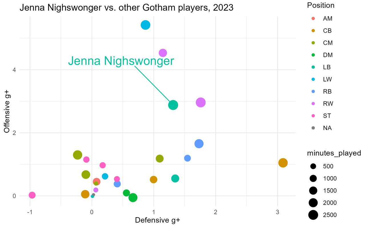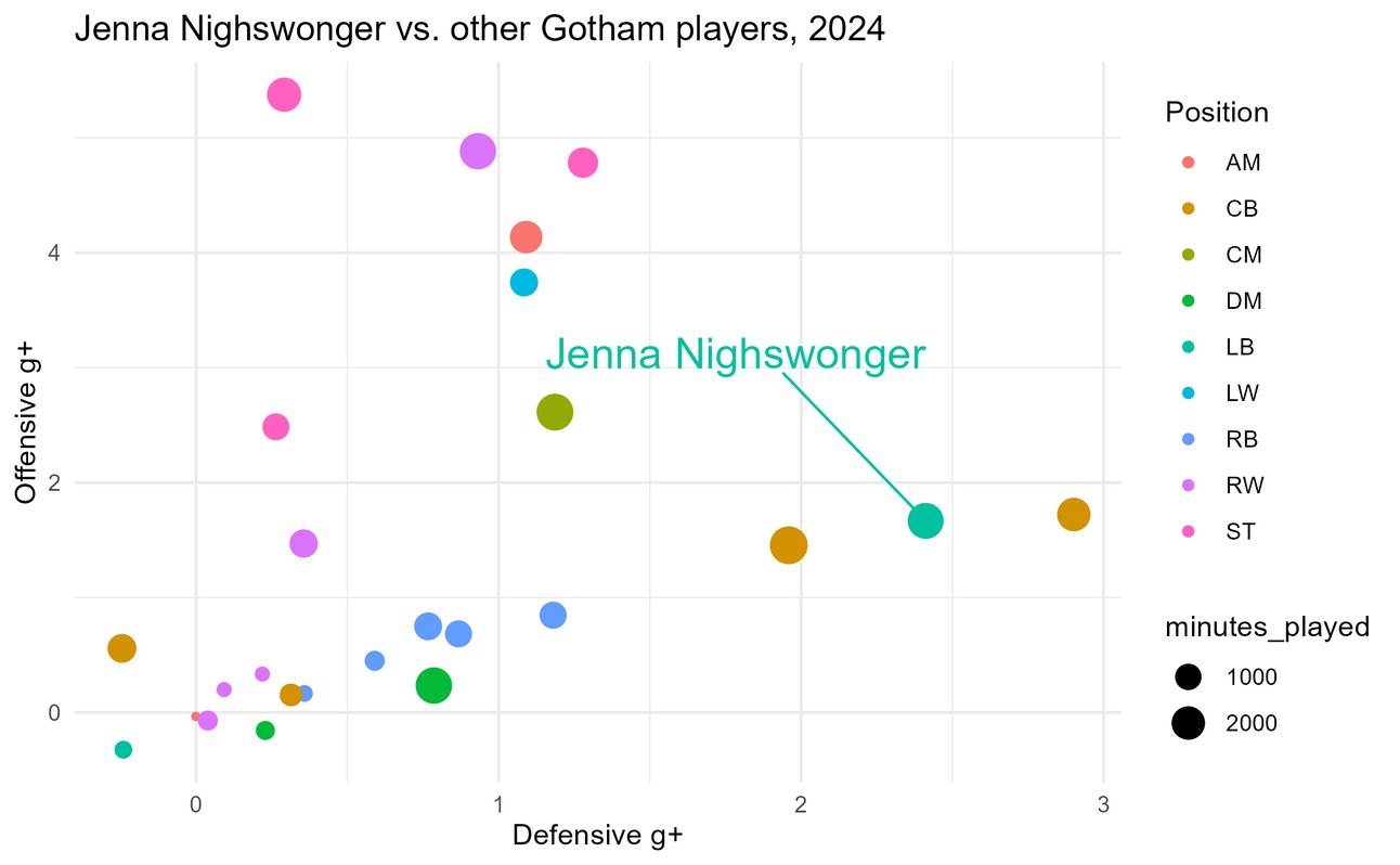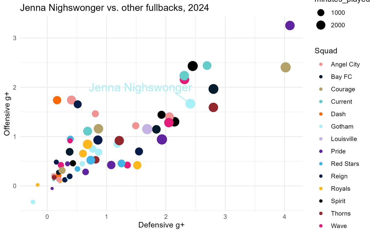 Welp. Hearing about Jenna Nighswonger leaving Gotham for Arsenal today made me feel… stressed? No wait, sad? When players like Delanie Sheehan, Yazmeen Ryan, and Lynn Williams left Gotham, I also felt similarly sad, but I also felt really stressed about the implications of their departure on the team’s strength. In contrast, by the end of the 2024 season, Jenna Nighswonger often found herself on the bench. With this news about Jenna, I’m not sure how to feel. The narrative around Jenna in 2023 and early 2024 was so different from the narrative around her now, so I decided to turn to data to see if I could parse through my feelings about her leaving on purely a soccer performance level.