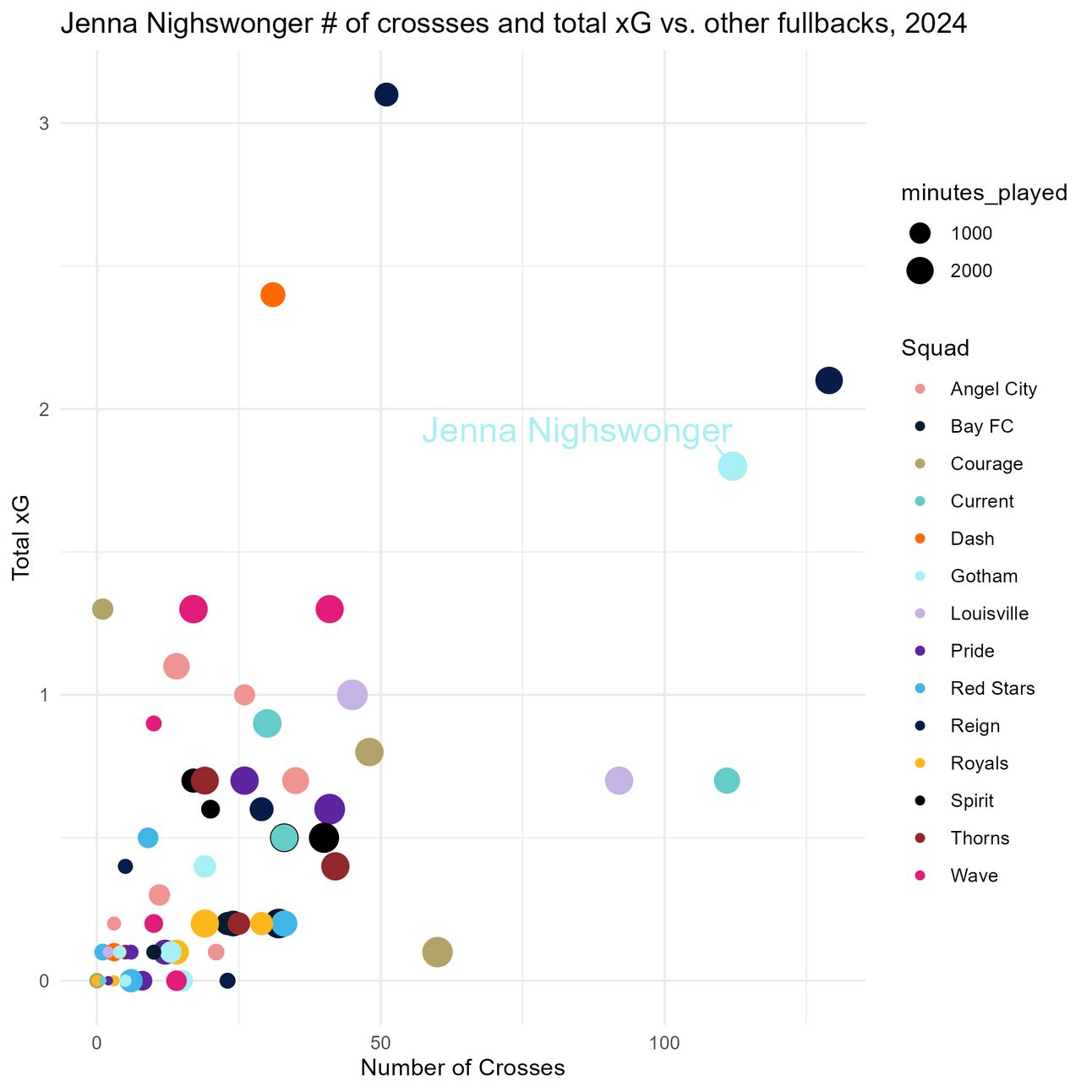 Visual #6: Jenna vs. other fullbacks on crosses and total xG, 2023 vs. 2024