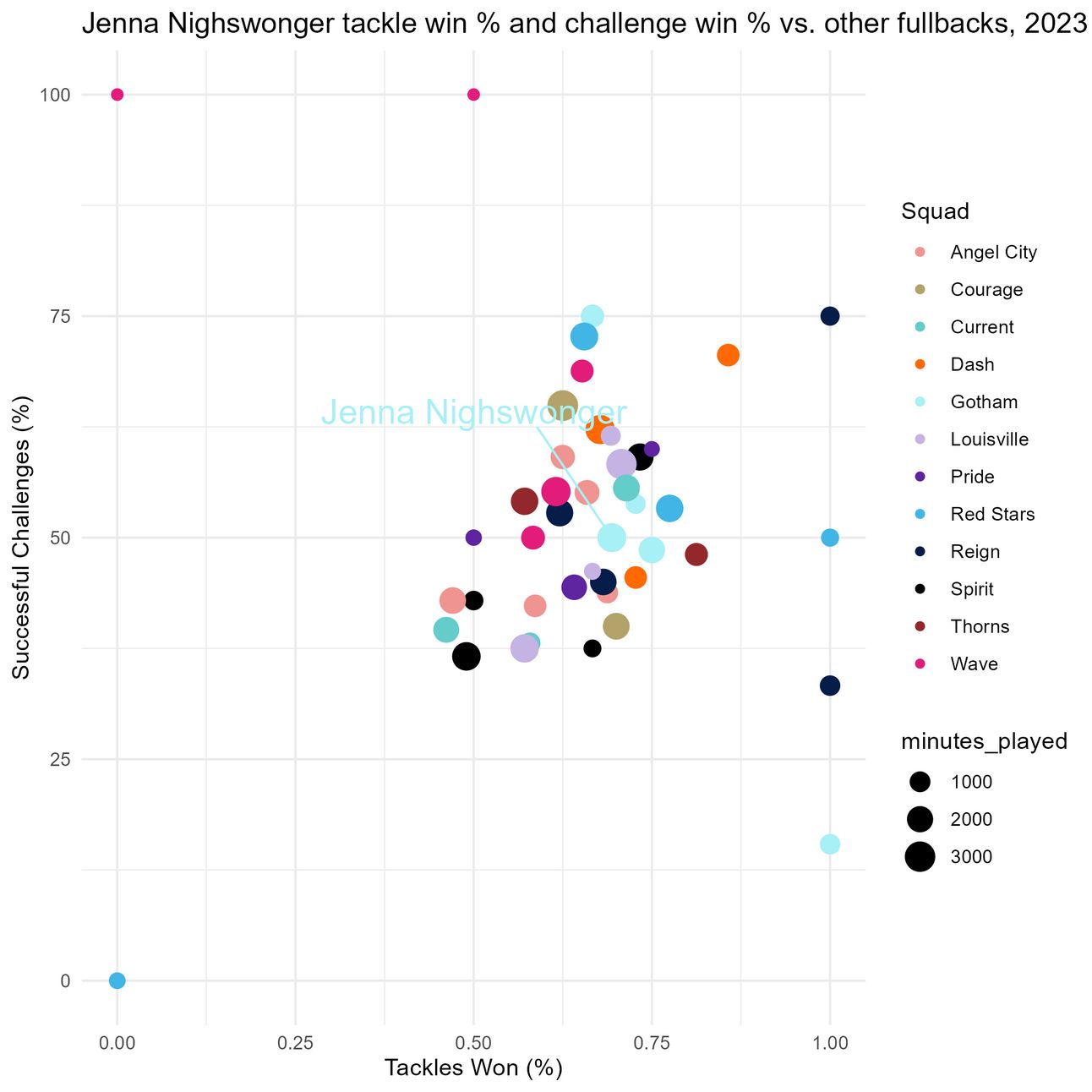 Visual #10: Jenna vs. other fullbacks on tackle and challenge win %, 2023 vs. 2024
