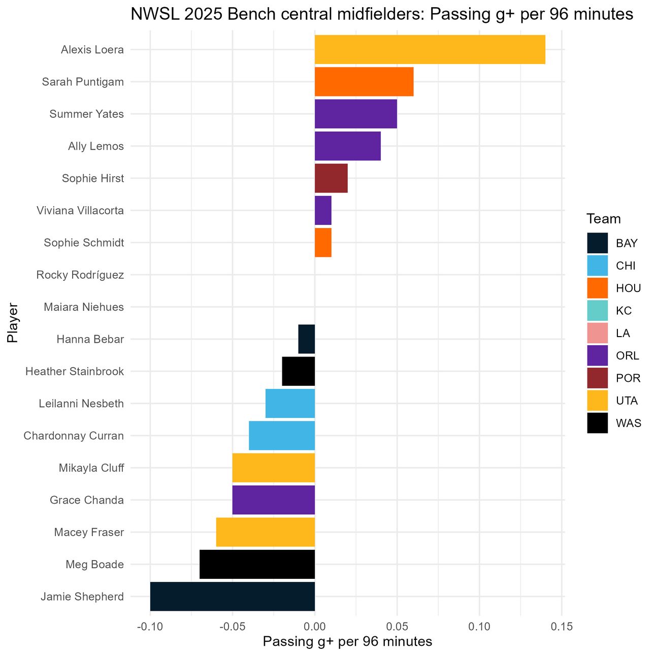 Finally, if we look at passing g+ to get a better idea of how these players’ passing affects their teams’ chances of scoring and conceding, Sarah Puntigam, Summer Yates, and Ally Lemos lead the pack (if we’re only looking at those with at least a full half worth of minutes this season).
