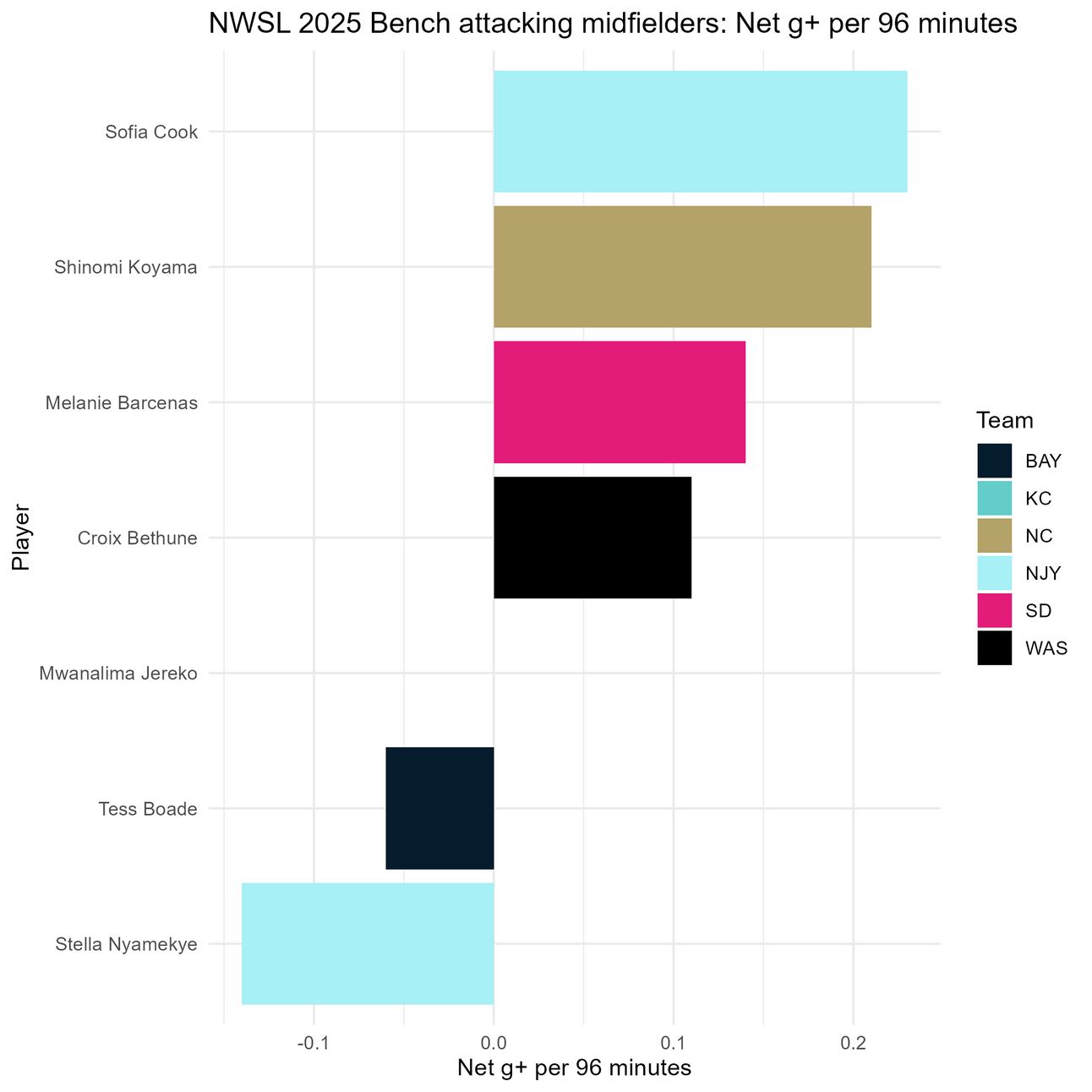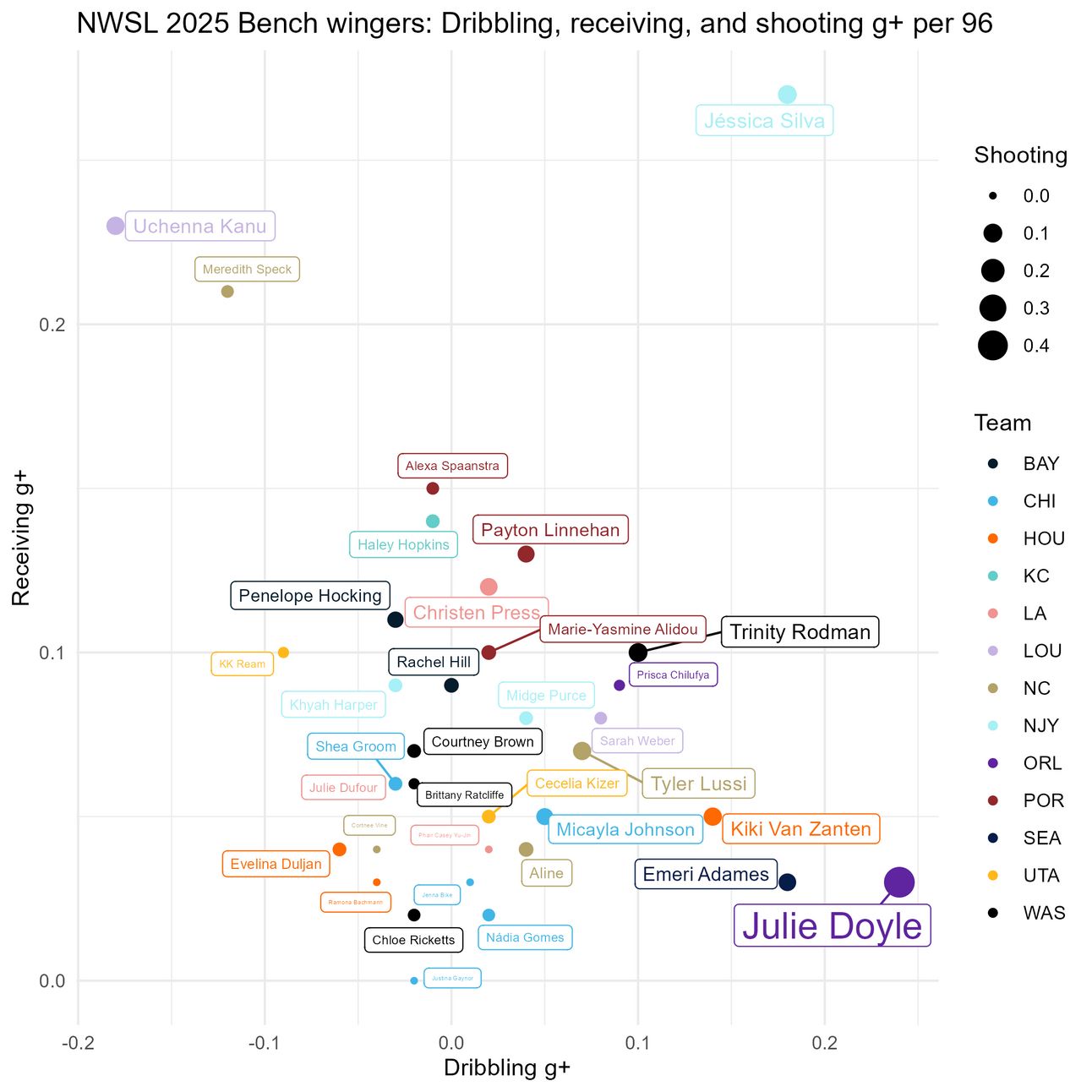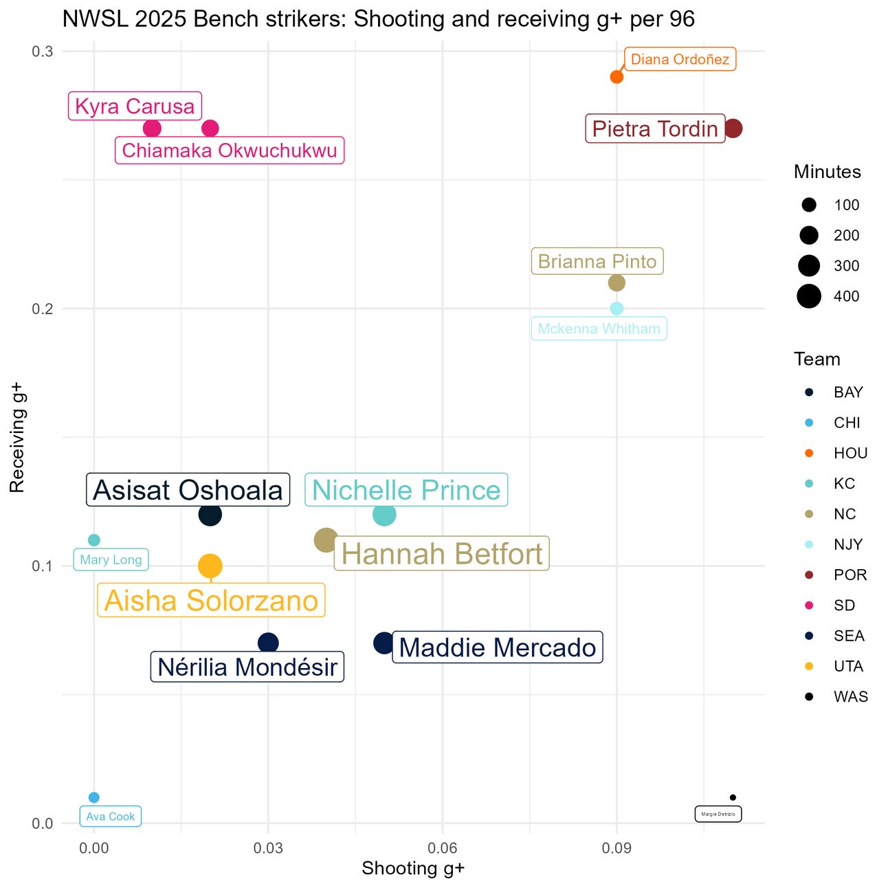 Sofia Cook leads in g+ per 96 minutes, but she has also played the second-fewest minutes on this list, behind teammate Stella Nyamekye. What you don’t see here is Cook is the only player with positive dribbling g+, and Croix Bethune leads in receiving and shooting g+, which is important when the objective of the game is to score goals.