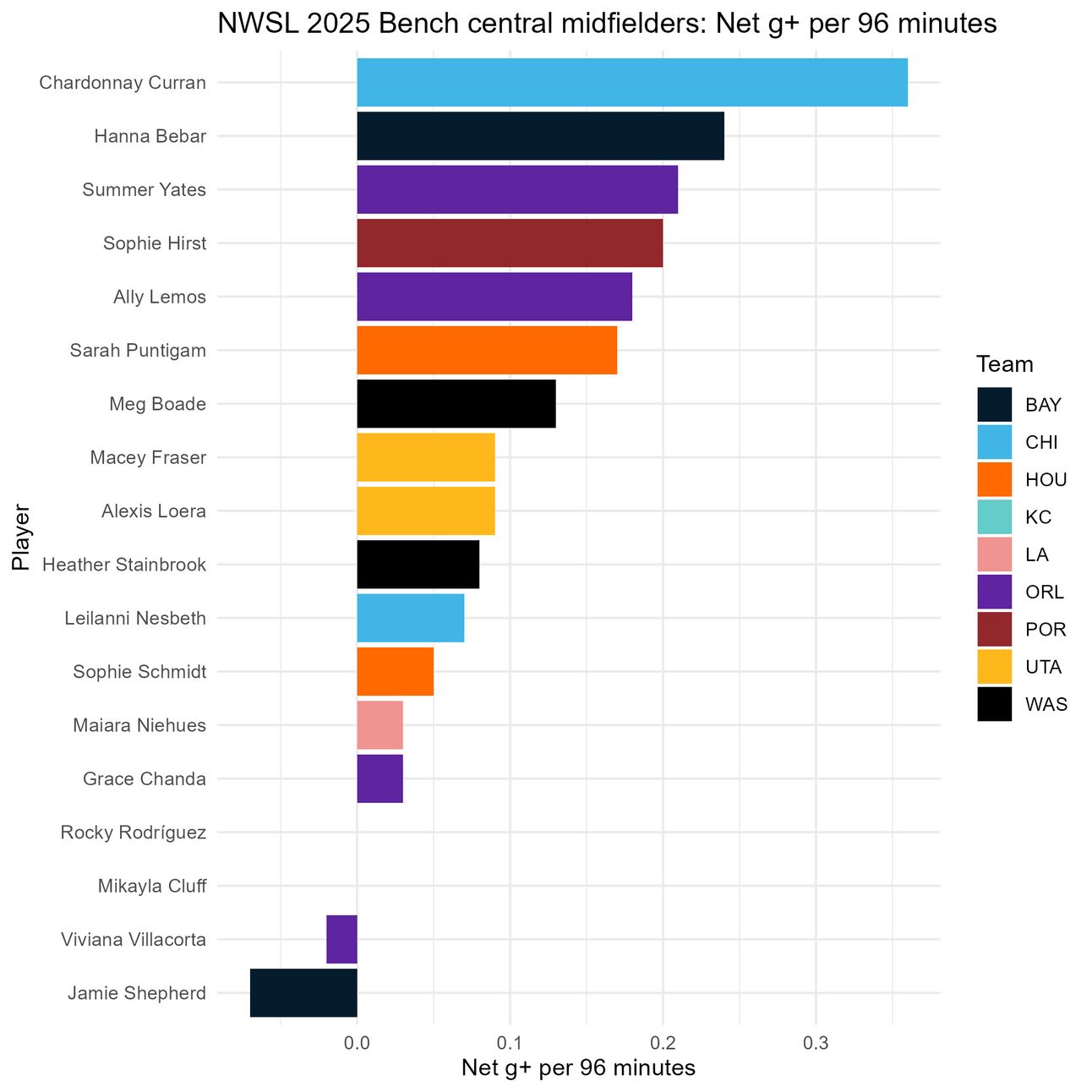 The league has 18 bench central midfielders who have seen minutes this season, and here we see the Orlando Pride’s actual embarrassment of riches. The odds favor an Orlando player taking this spot, but let’s take a look at the numbers.