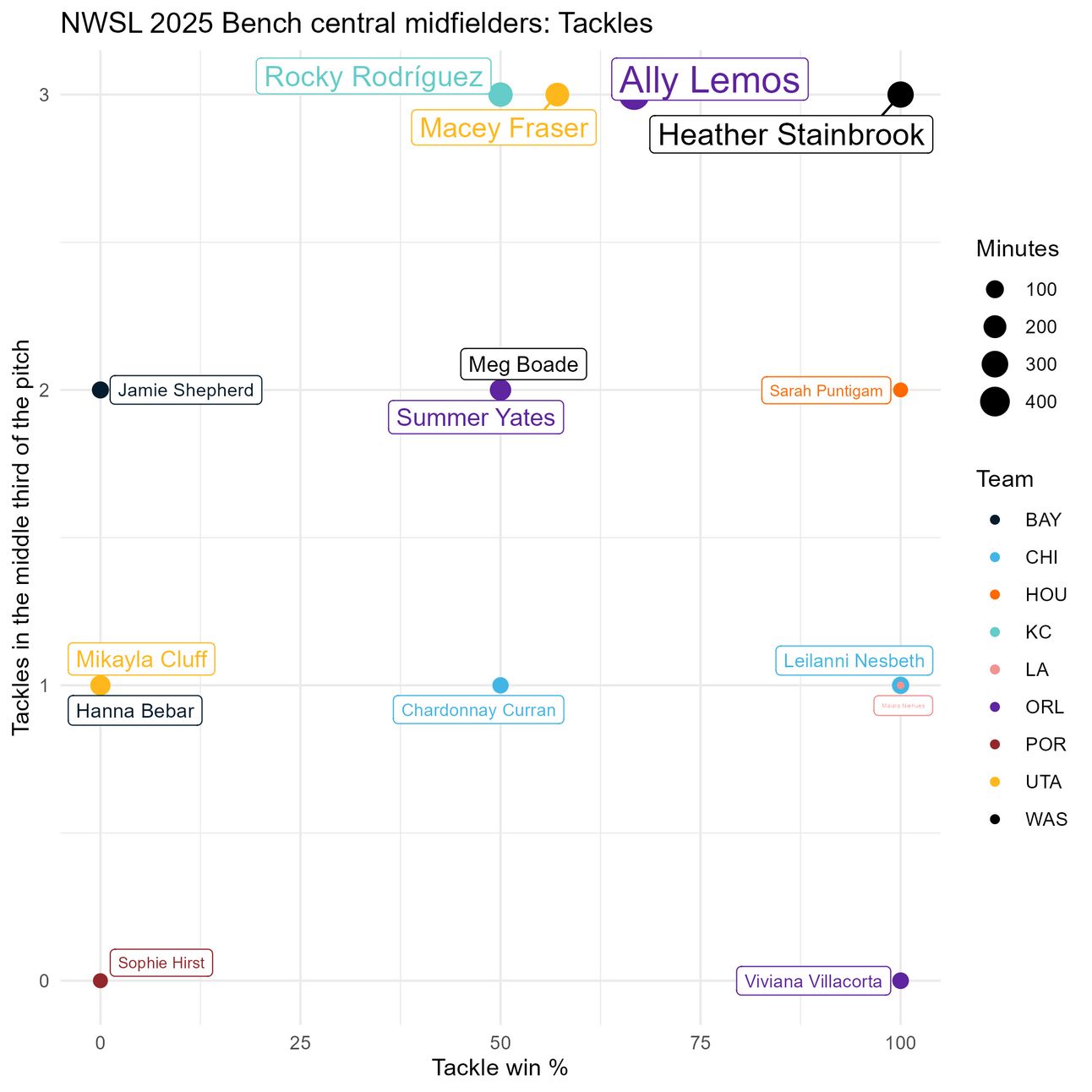 This graph looks at how many times a player failed when attempting to control the ball (miscontrols) and how many times a player lost the ball following a tackle (times dispossessed). Marisa DiGrande and Taryn Torres lead in both measures, but they are at a bit of a disadvantage because of how many minutes they’ve played compared to some of the others on this list. Mallie McKenzie stands out for having been dispossessed exactly 0 times, and Ainsley McCammon has the best numbers of those with at least 90 minutes.