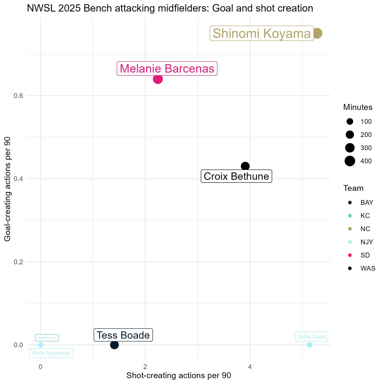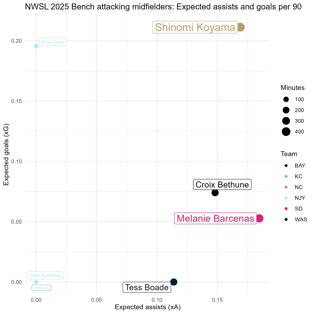 Here, we start to see anomalies. Of those with significant minutes, Jéssica Silva leads in xG per 90, and Casey Phair leads in xA. Interesting.