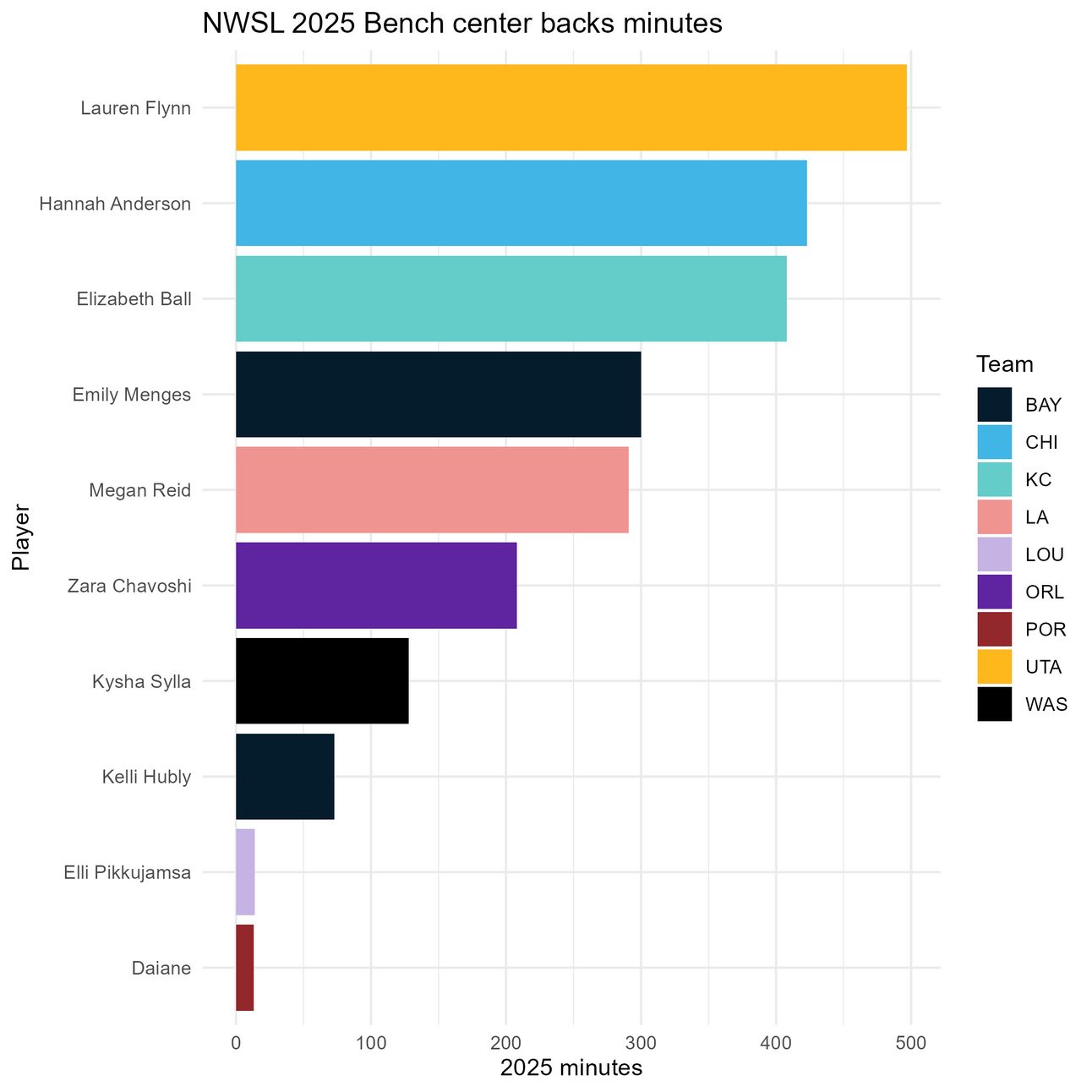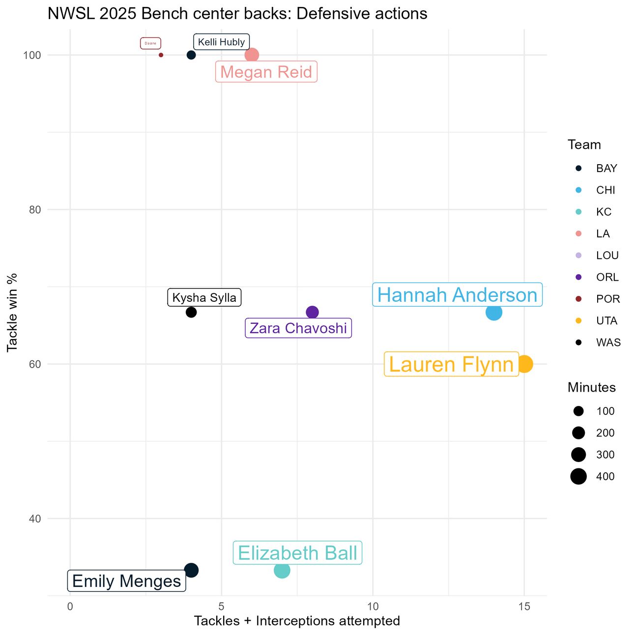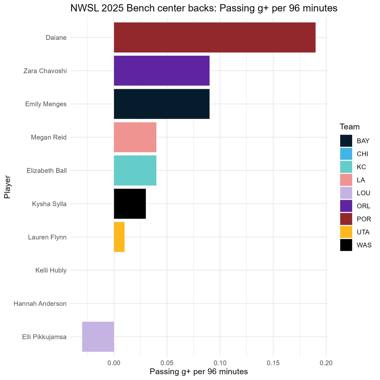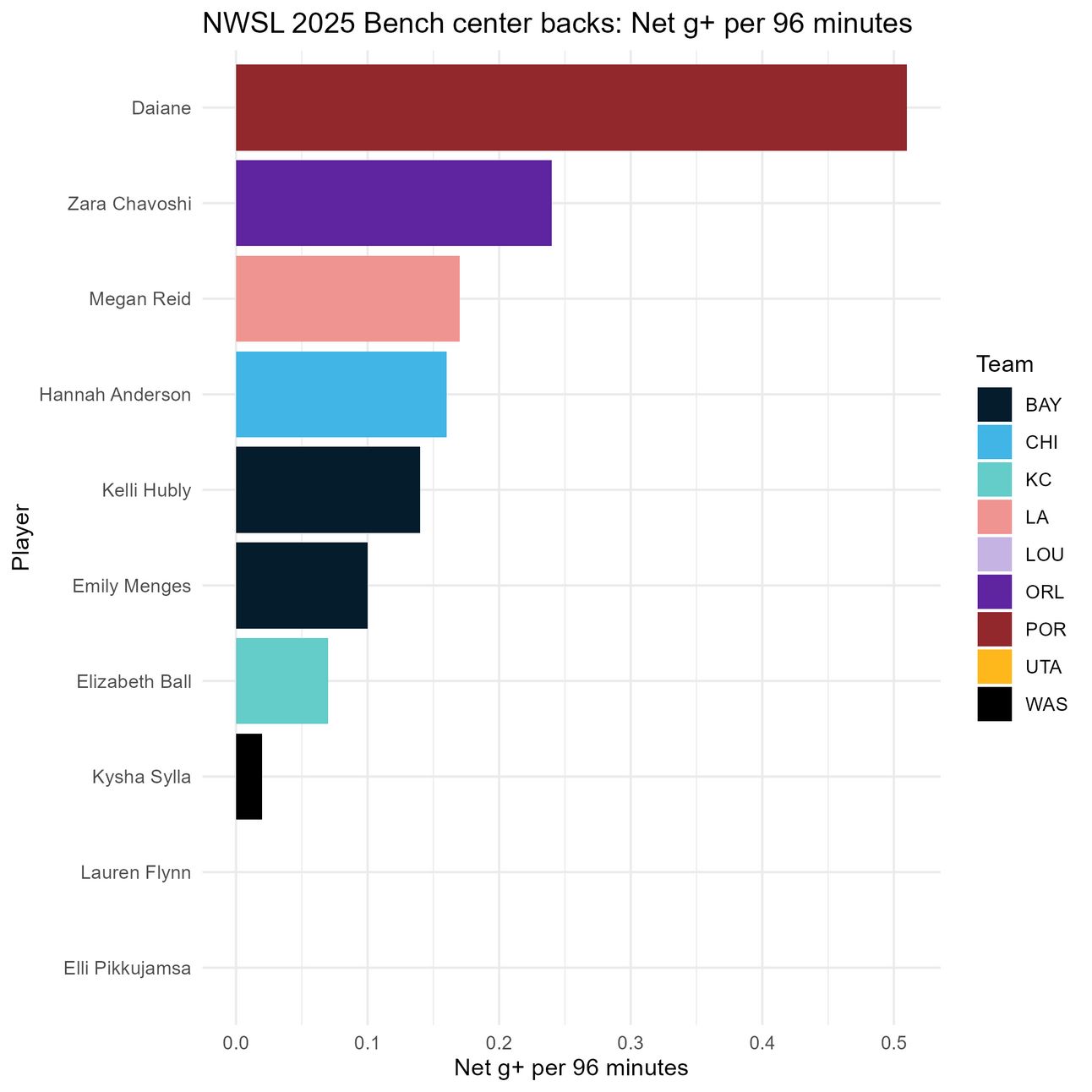 Again, Daiane stands out here, but it’s important to consider that she has played all of 13 minutes this season. Among those with more minutes, Kelli Hubly, Zara Chavoshi, and Hannah Anderson stand out. Elli Pikkujamsa again has a net 0 impact, and Kysha Sylla seems to have a negative one.