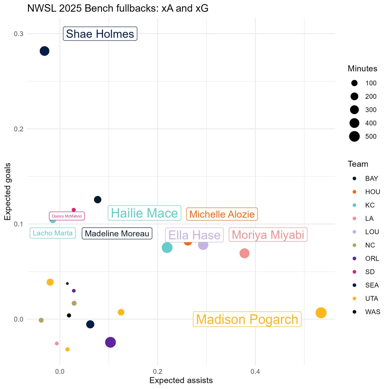 Shae Holmes (who has a goal to her name this season) has the highest xG in this group with 0.3, while Madison Pogarch has the highest xA, with 0.5. The four people in the middle of the graph also stick out–Hailie Mace, Ella Hase, Michelle Alozie, and Miyabi Moriya all sit on 0.1 xG on the season, with 0.2, 0.3, 0.3, and 0.4 xA, respectively.