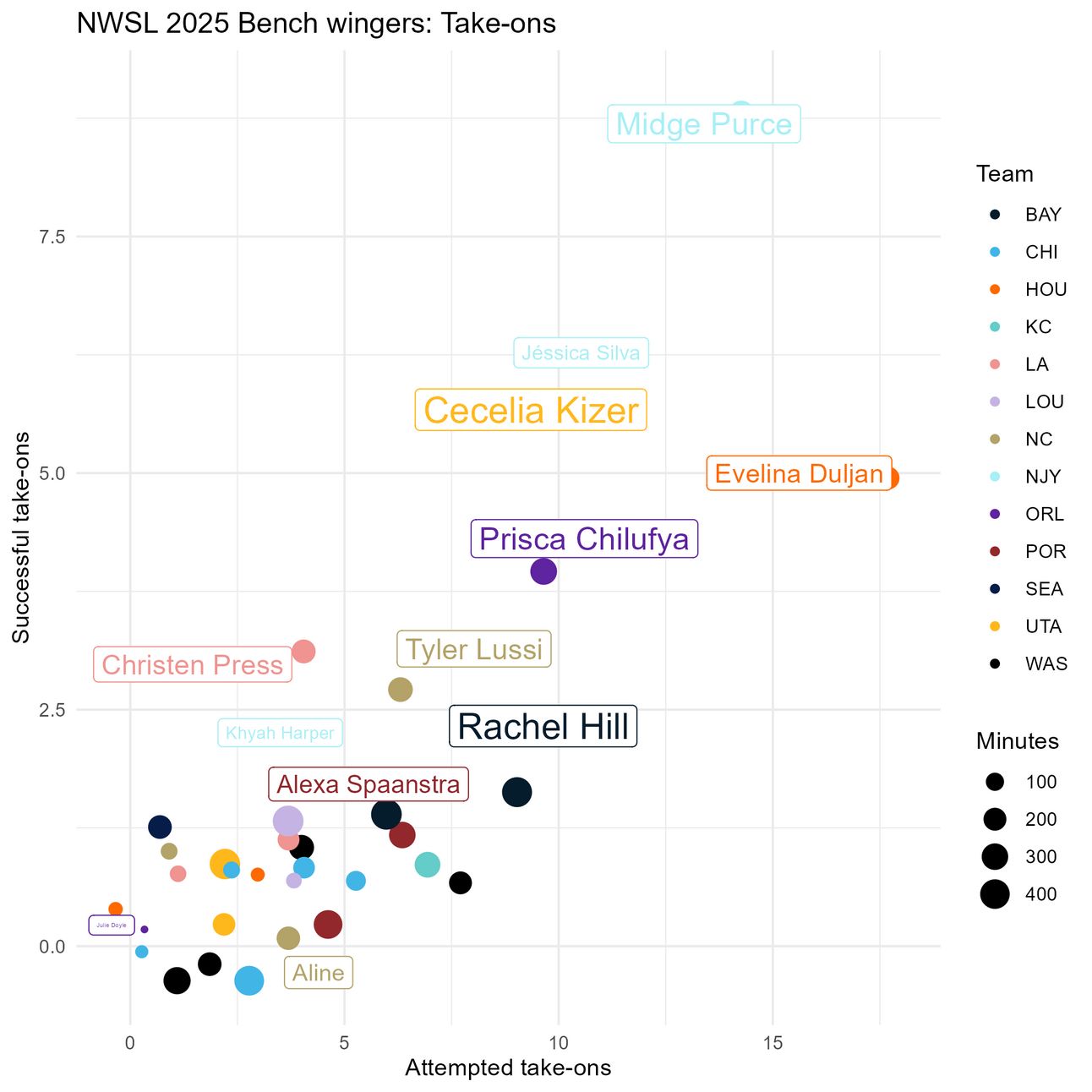 The successful take-on leader here is Midge Purce, followed by Cece Kizer and Jéssica Silva. Evelina Duljan has attempted the most take-ons, and although she hasn’t succeeded most of the time, it is still much better than not attempting to take defenders on.