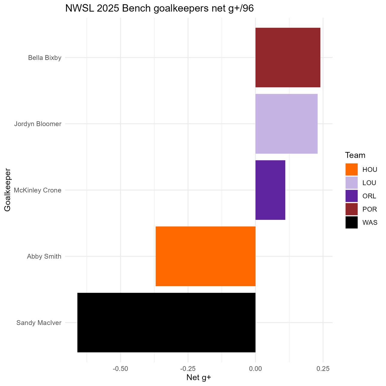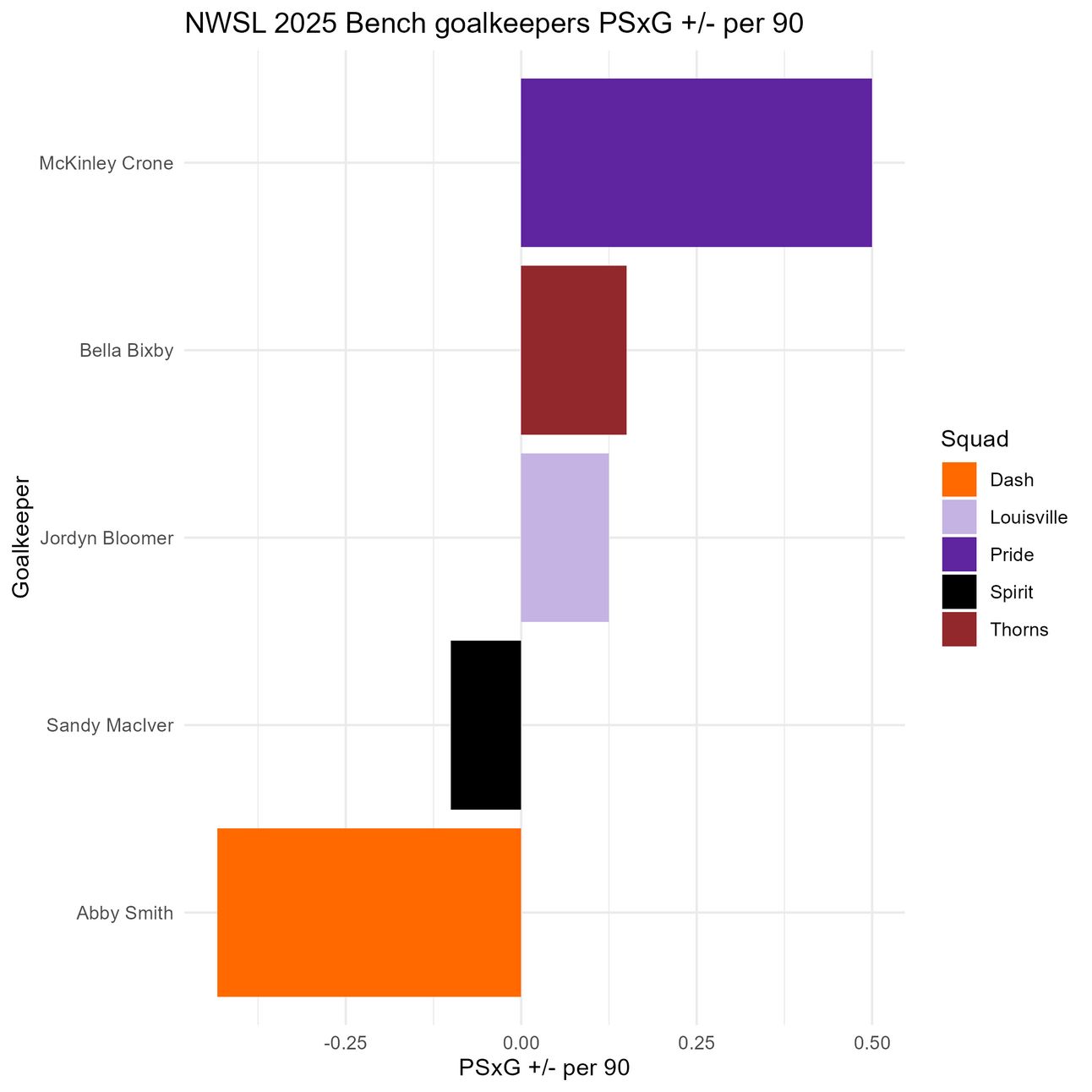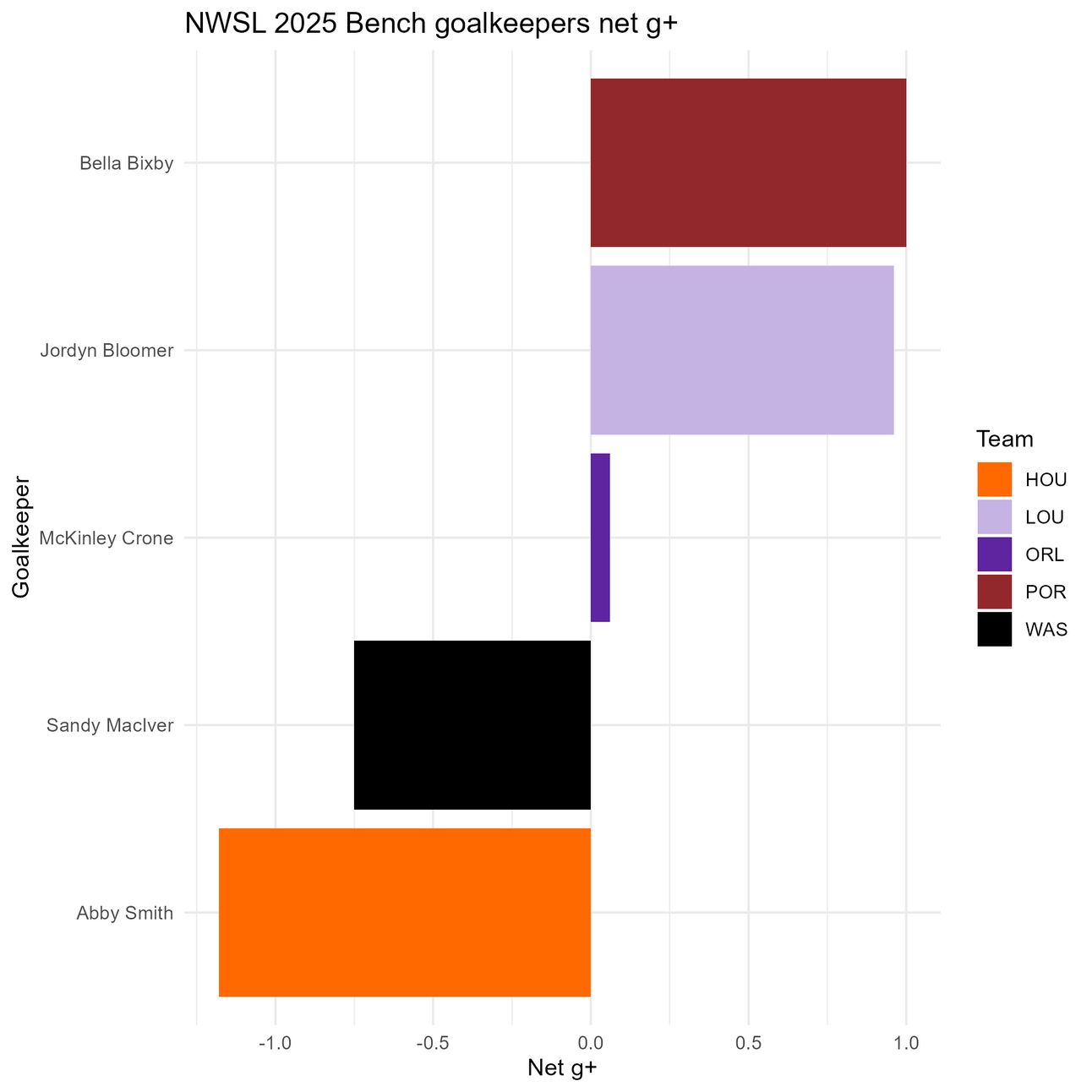 There have been only 5 bench keepers who have seen minutes so far this season: Bella Bixby, Jordyn Bloomer, McKinley Crone, Sandy MacIver, and Abby Smith (Halle Mackiewicz got a few minutes in after being subbed in at the 90th minute last weekend, but that is way too little data, so she stays out of the running for now. Sorry Halle). The most fundamental part of being a goalkeeper is not letting in goals, but there are other factors we can also look at, such as the PSxG/goals allowed differential and g+.
