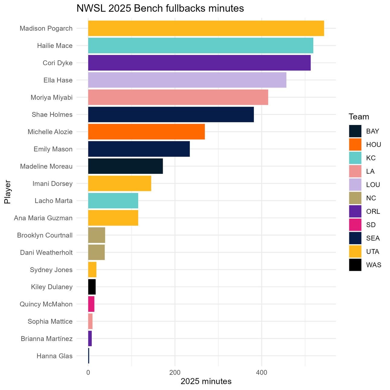 We are now 10 weeks into the NWSL season, and I’ve been thinking a lot about bench players–some teams are afraid to use their benches, and others have an embarrassment of riches. I decided to look into who the best bench players in the league have been. Could a team made up entirely of bench players beat the Utah Royals or the Chicago Stars, or even the Houston Dash?
