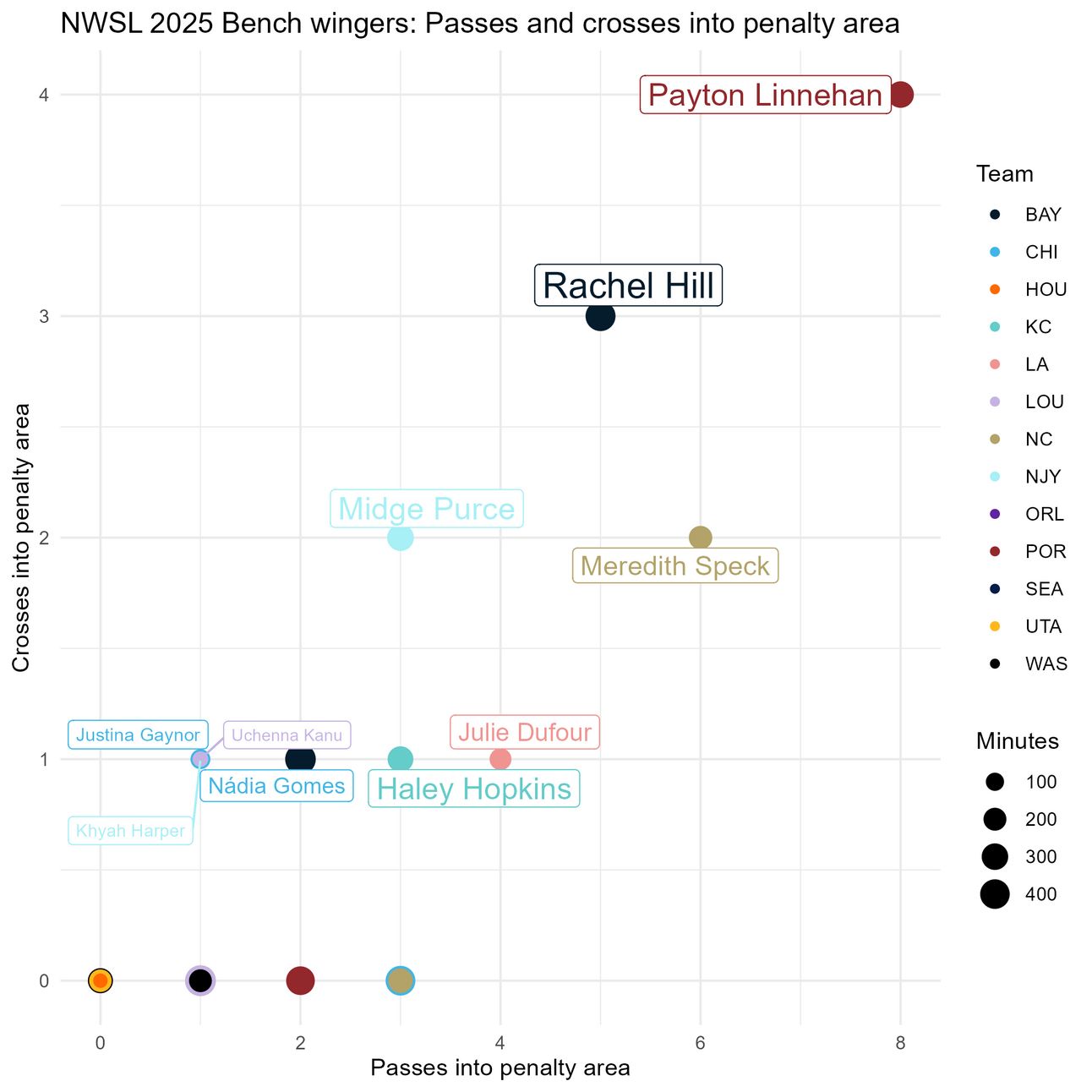 Payton Linnehan leads in both measures, by a lot, and Rachel Hill and Meredith Speck are not too far behind. Passes into the penalty area is the more important measure here, and Julie Dufour has an impressive amount relative to the number of minutes she’s gotten.