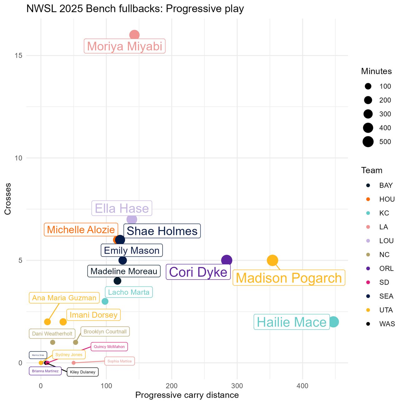 Miyabi Moriya stands out here, having attempted 16 crosses, 9 more than anyone else on this list, but she hasn’t carried the ball forward as much as some of the other players. Hailie Mace has the most progressive passing distance, but she has only made 2 crosses.