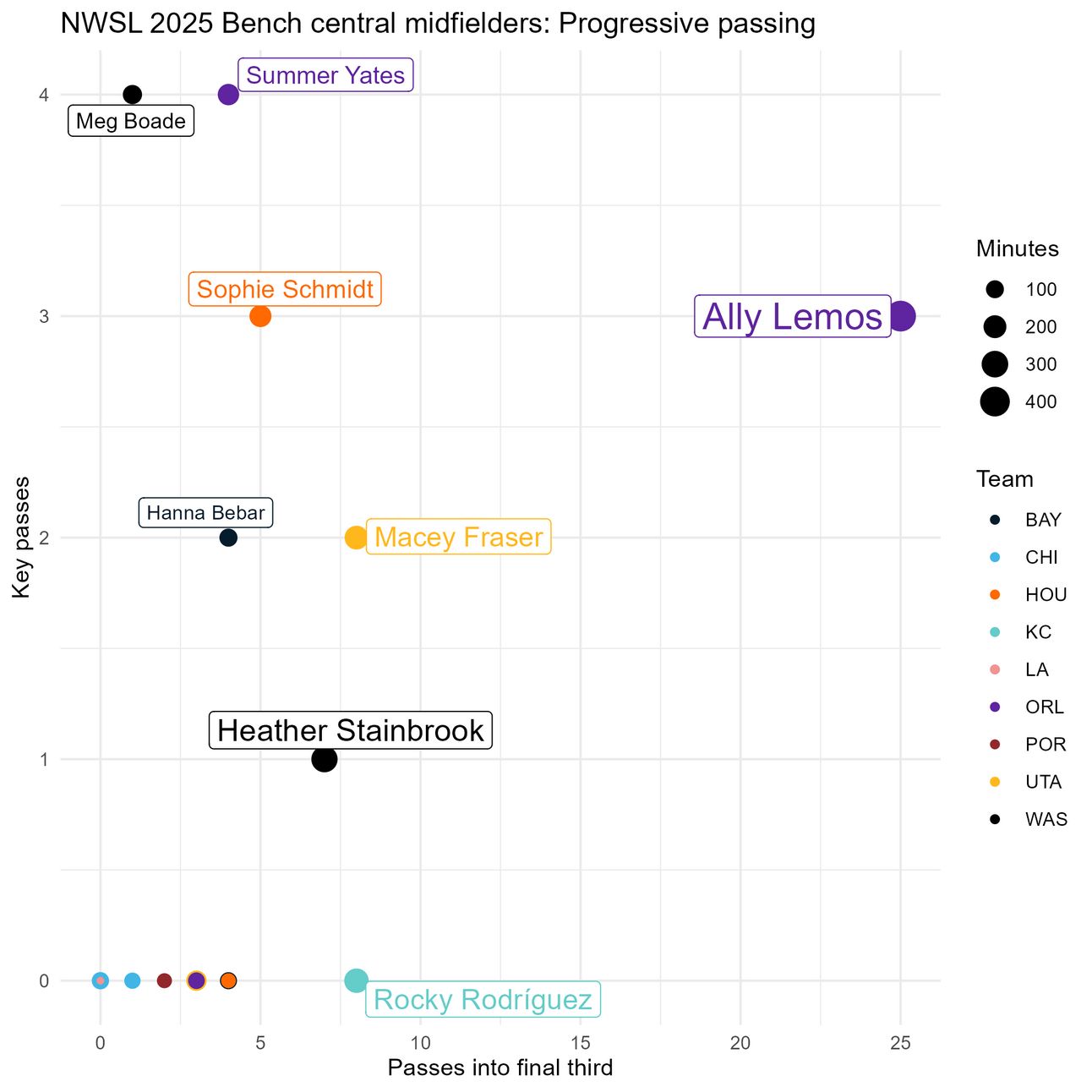 First, if we look at pass completion and what percent of attempted passes were progressive, we can rule out Chardonnay Curran, Meg Boade, and Leilanni Nesbeth. Sarah Puntigam stands out for how many of her passes are progressive, but her pass completion rate leaves a lot to be desired. Her teammate Sophie Schmidt has the highest pass completion rate, but has the fourth lowest proportion of progressive passes. Hannah Bebar, Ally Lemos, Grace Chanda, and Macey Fraser strike a nice balance here.